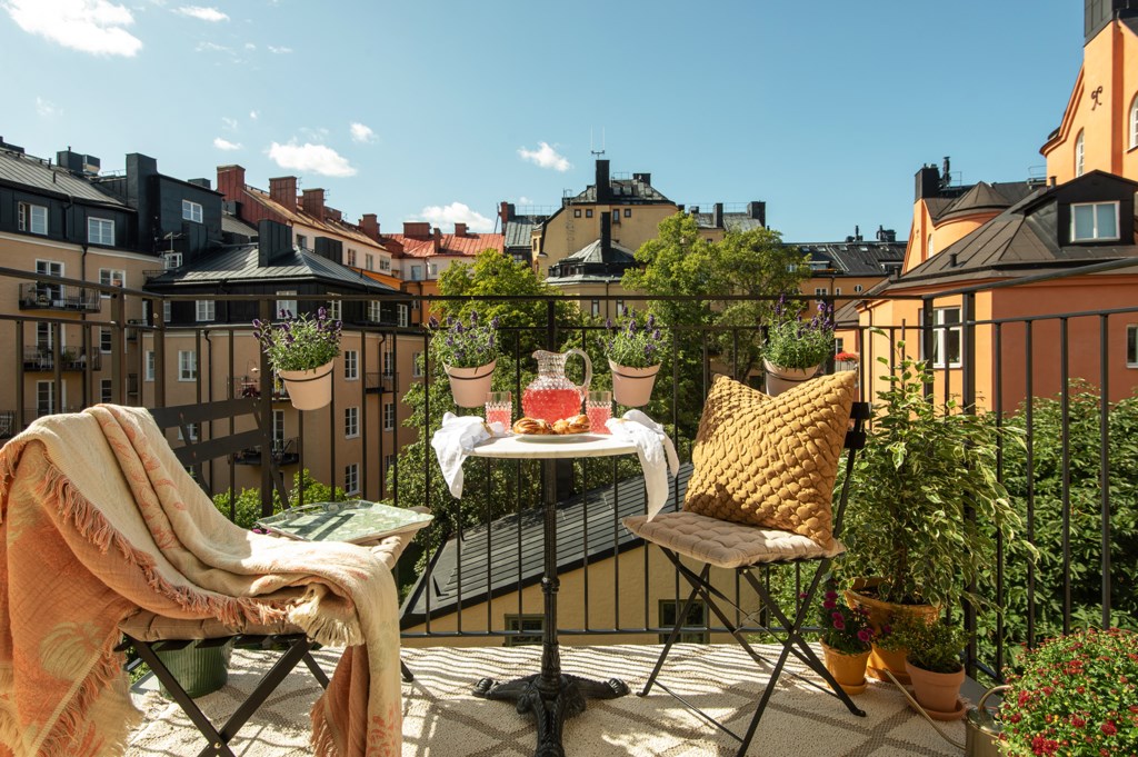 Härlig terrass om ca 7 kvm i österläge vilket ger fin sol under förmiddagen. Bra plats finns för en hörnsoffa, bord, stolar, planteringar och grill. Här skapar du en egen oas helt bortom stadens brus!