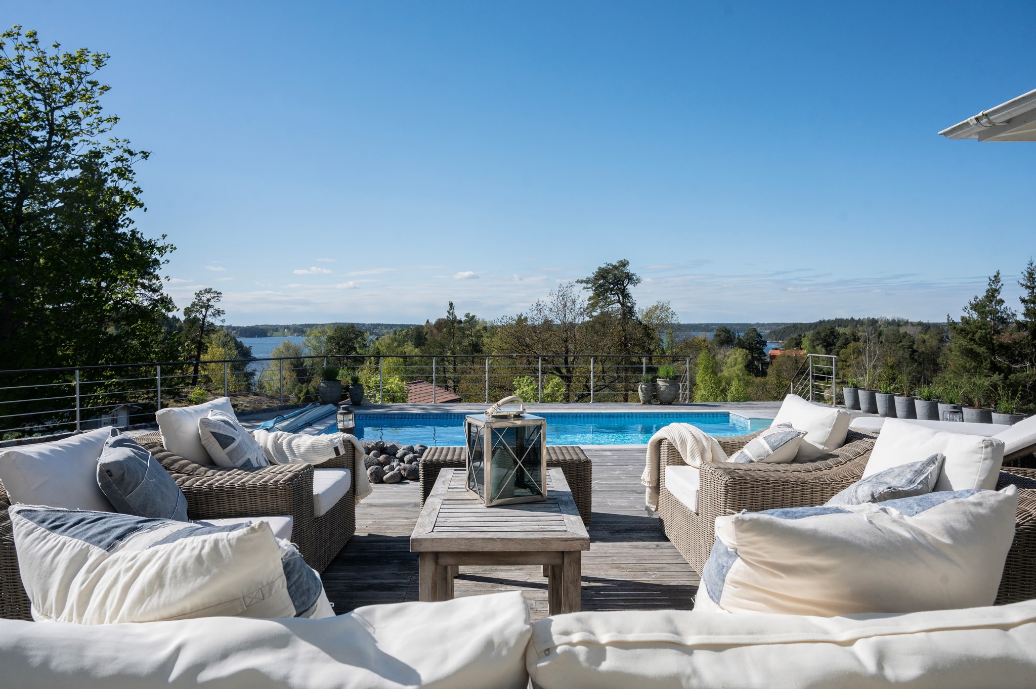 Den generösa terrassen och poolområdet skapar en privat och exklusiv miljö för soliga sommardagar och sociala tillställningar, med naturen och sjön som ständigt närvarande kuliss.