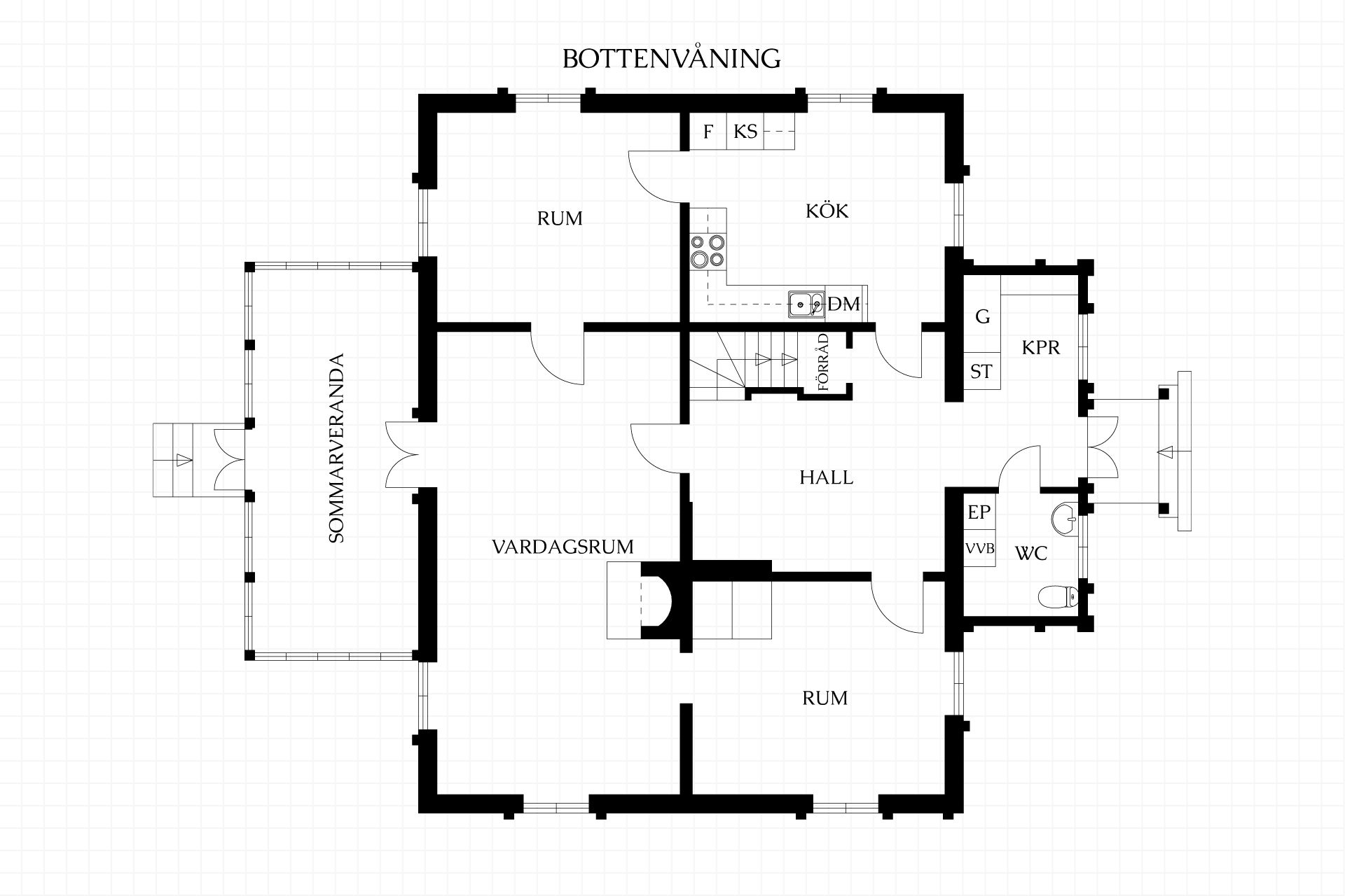 Vardagsrummet präglas av ljus, rymd och klassiska detaljer. En kakelugn skapar värme och karaktär, ljuset och rymden från en bra takhöjd och två spröjsade fönster med djupa fönsternischer och fönsterspeglar som vetter mot trädgården i väster. Rummets glasade dubbeldörrar leder vidare till den förtrollande glasverandan. I det vävspända taket sitter bevarad fast belysning i diskreta glaskupor, och rummets höga golvsocklar och såpskurade brädgolv förstärker den genuina känslan.