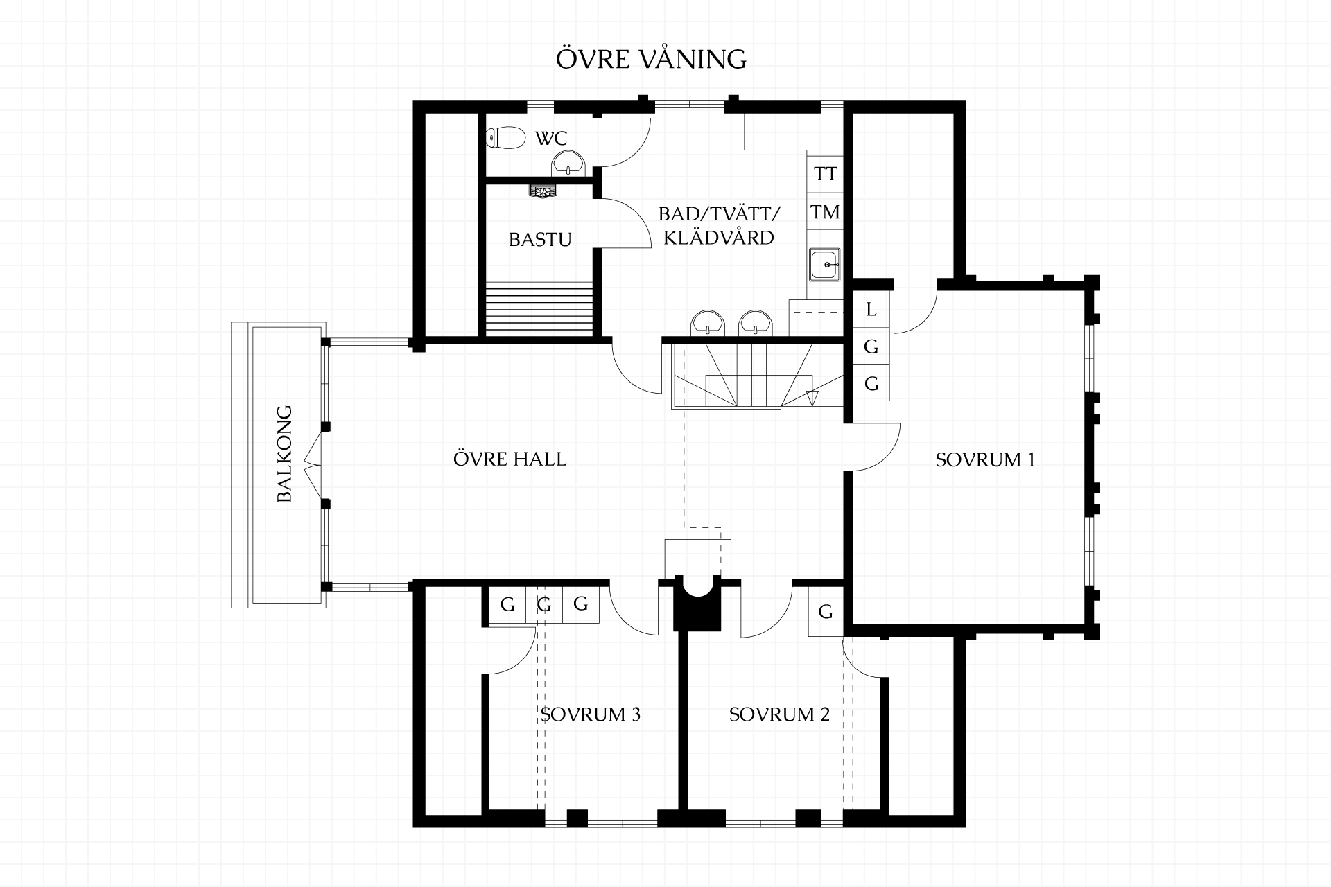 Via den svängda trappan med smidesräcke når man det övre planet – ett privat våningsplan med en mer intim känsla och en takhöjd om ca 2,40 m. Här löper vackra såpade trägolv genom samtliga rum och tidstypiska snickerier sätter tonen.