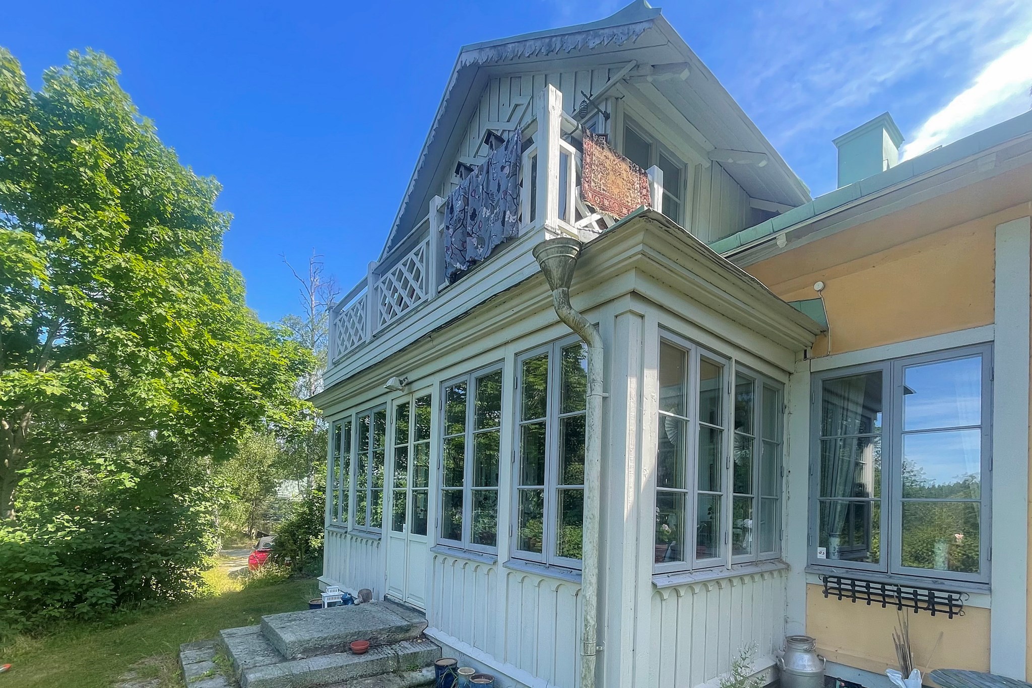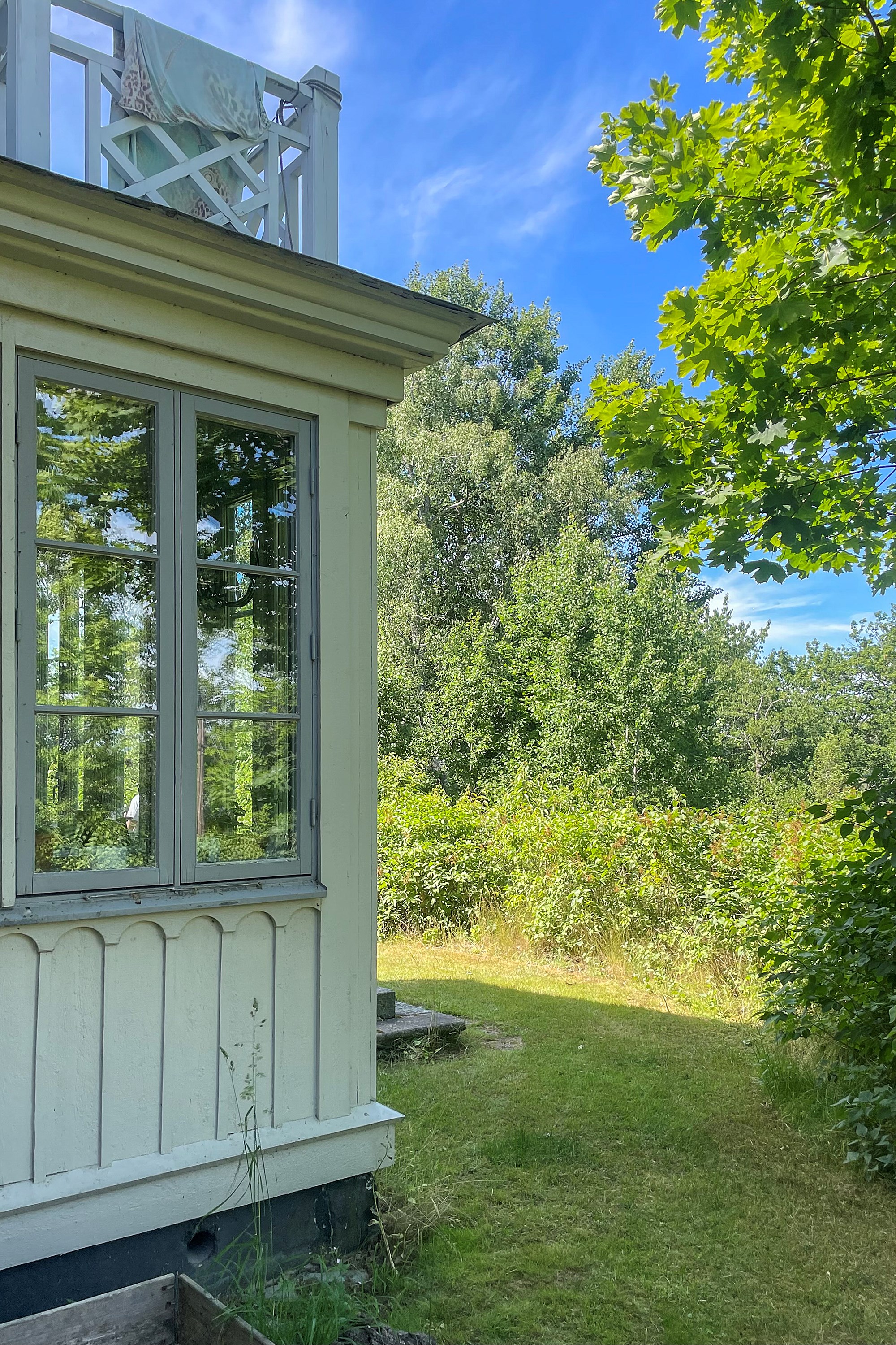 Glasverandan, med spröjsade fönster i tre väderstreck och altandörr ut mot syrenbersån, är en plats att älska året runt. Här ryms långbord för långa middagar i solnedgången, med glittrande sjöutsikt över Kyrkviken som kuliss.