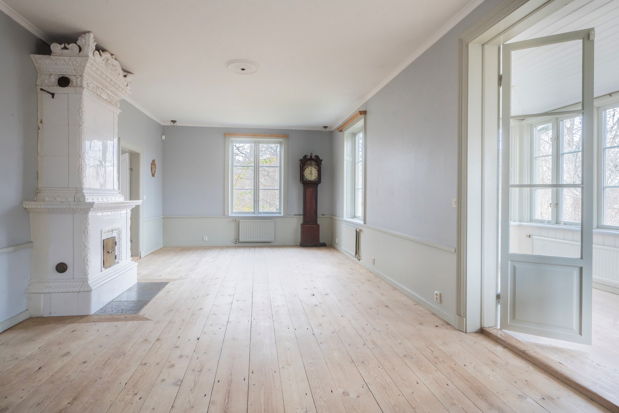 Ett stort allrum med vit kakelugn, burspråk och utgång till balkong med hänförande utsikt över Kyrkviken utgör hjärtat på planet – en plats för lugn samvaro eller stilla eftermiddagsläsning i kakelugnens sken.