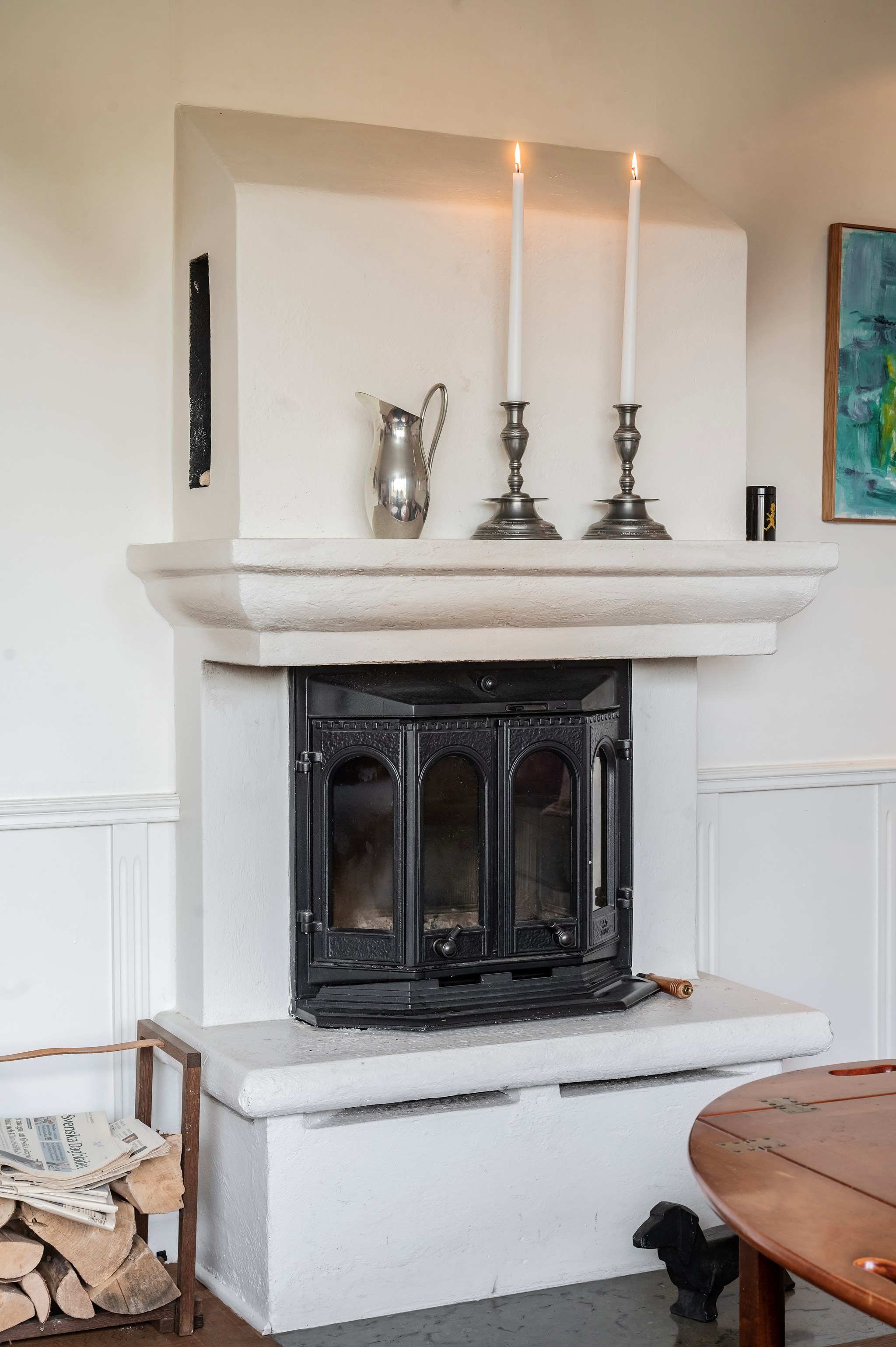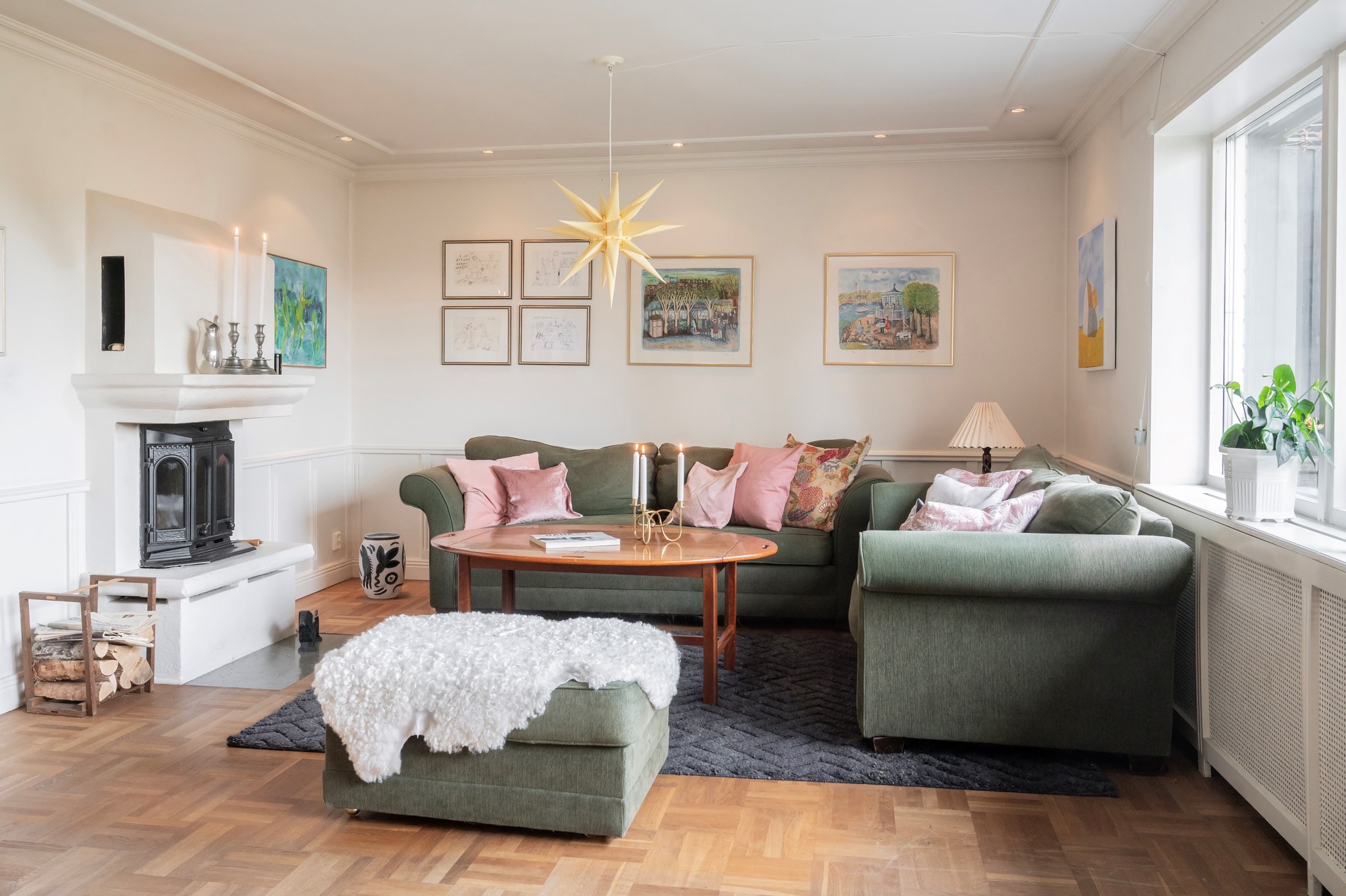 På entréplan öppnar ett stort och ljust vardagsrum upp med öppen spis och ett brett fönsterparti mot trädgården. Här flödar ljuset in och rummet förlängs ut mot den gröna gräsmattan – perfekt för lek, studsmatta och sommarens middagar på altanen. I vardagsrummet finns en inbyggd bokhylla som är fast och kommer ingå i huset.