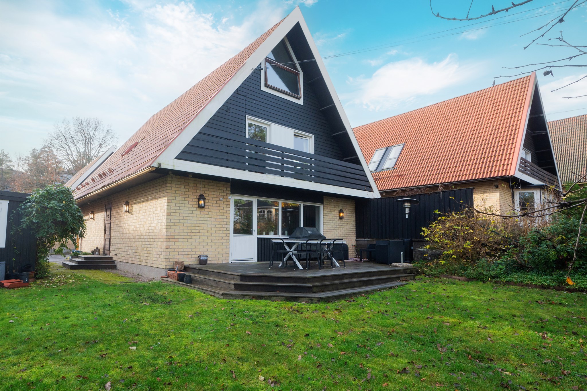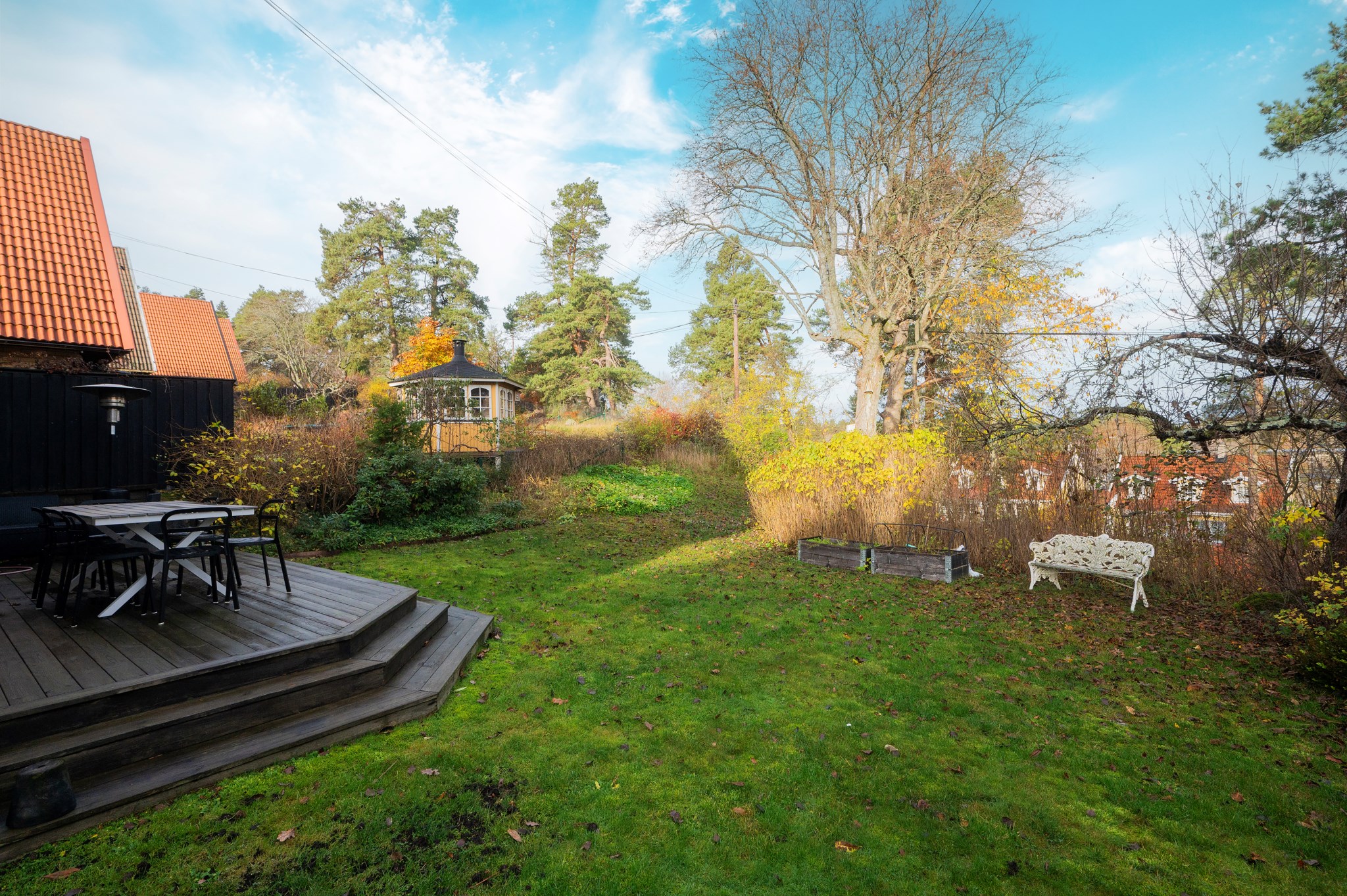 Från vardagsrummet nås den insynsskyddade trädgårdssidan med altan/uteplats där inomhus och utomhus flyter samman – ett naturligt extra rum under sommarhalvåret. Tomten gränsar mot allmänning med gräsmatta för lek och spel.