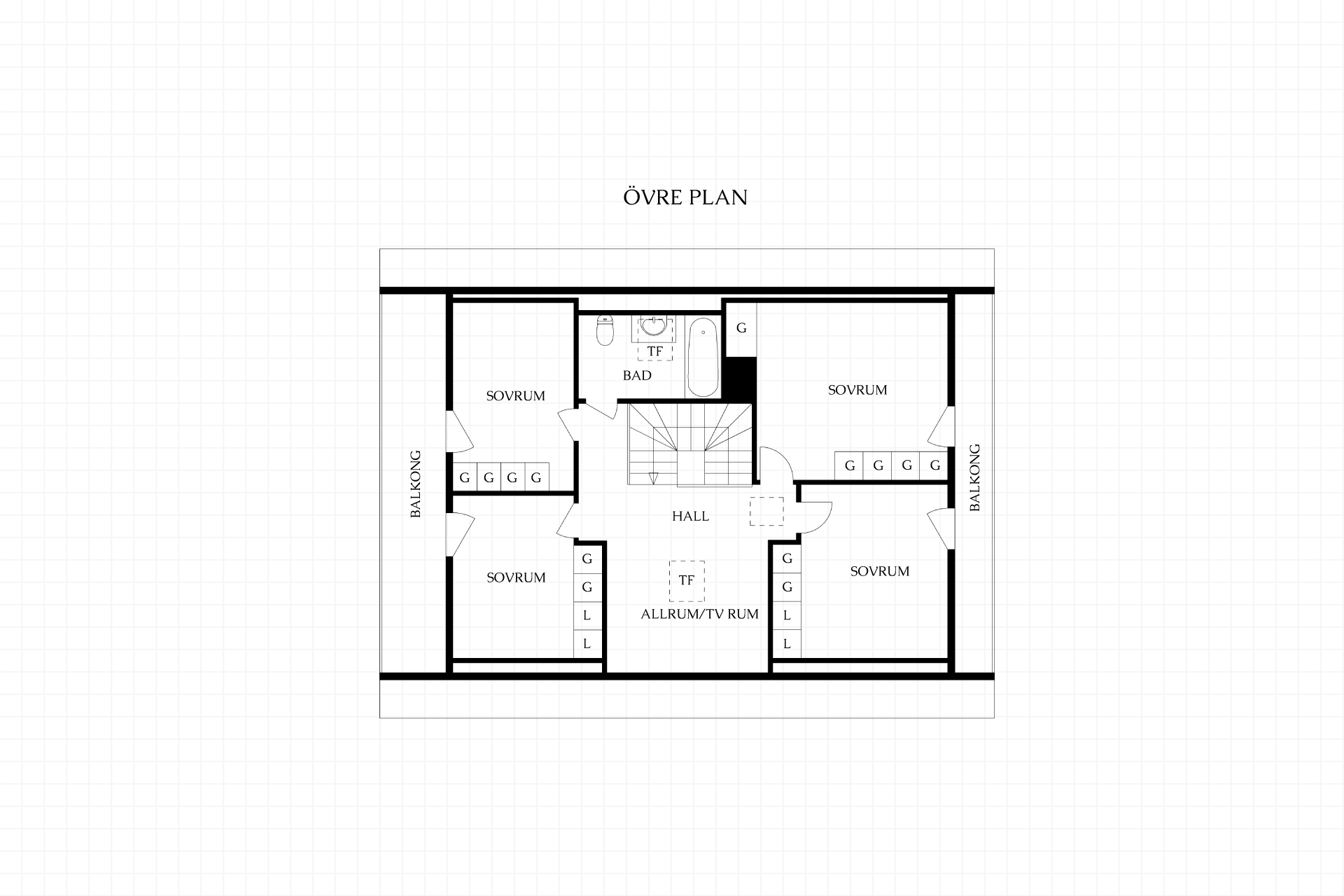 På övre plan möts du av ett luftigt allrum med plats för soffa och TV, samt fyra väldisponerade sovrum. Master bedroom har gott om garderober och utgång till balkong mot trädgården. De tre övriga sovrummen är ungefär lika stora, samtliga med plats för säng, skrivbord och förvaring – och alla har utgång till balkong.