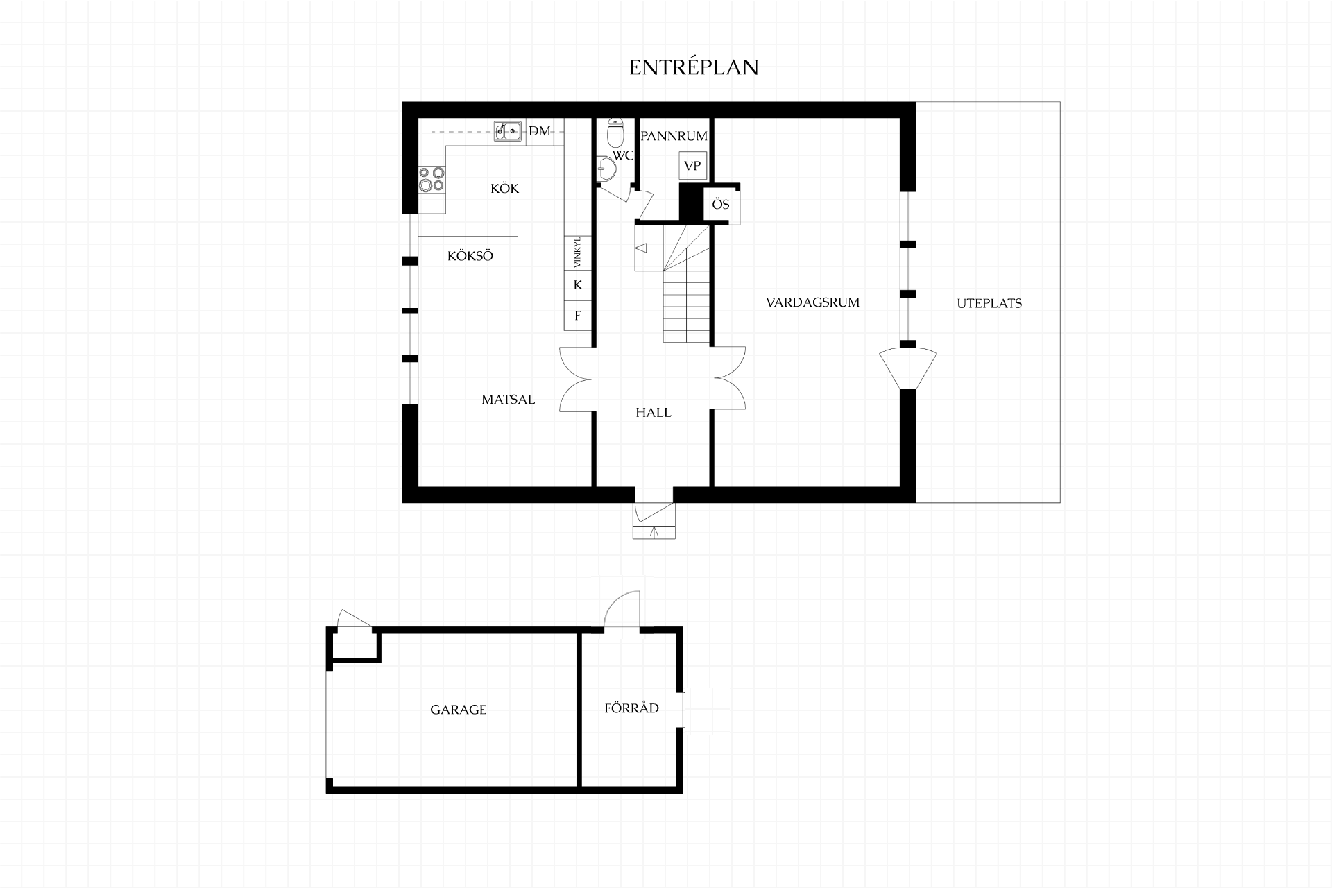På entréplanet finns även gäst-WC samt pannrum med praktiska ytor. Den vackra svängda trappan leder upp till övre plan.