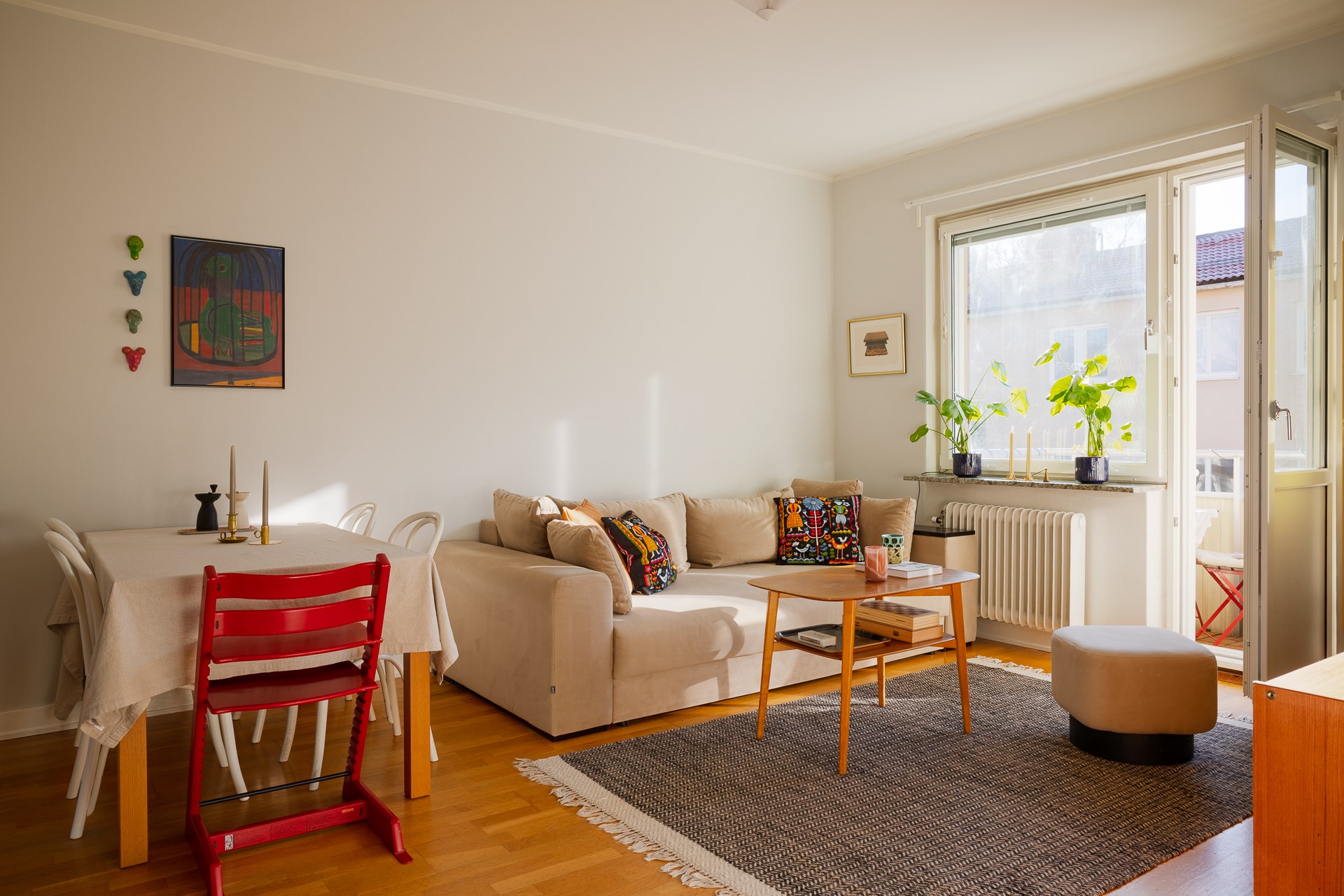 Ljus och charmig funkistrea med södervänd balkong, grönskande omgivningar och i skuldfri förening. På ett lugnt men samtidigt supercentralt läge, med pittoresk småstadskänsla finns detta otroligt mysiga hem. Ljusa, luftiga och väl avvägda rum samt fönster i två väderstreck vilket gör att ljuset flödar genom rummen. Planlösningen inbjuder till mingel och middagar för många vänner och balkongen förlänger umgängesytorna. Det ursprungliga matrummet är kvar vilket gör att man har såväl ett bra extra sovrum, arbetsrum eller matplats. Sovrummet som vetter mot grönskan på baksidan är rofyllt och rymligt samt har mycket bra förvaring. Renoverat badrum i smakfullt utförande och med tvättmaskin. Huset som är byggt 1944 har den äldre charmen bevarad och funkisens strama formspråk och stora fönsterpartier vilket gör bostaden såväl ljus som lättmöblerad. Mycket välskött och trevlig bostadsrättsförening som är obelånad vilket ger en ekonomisk trygghet. Poppiskvarter med mysiga bagerier och restauranger. Tunnelbanan ligger någon minut bort och tar en på några minuter till Södermalm och city. Det korta avståndet till stan gör det även enkelt att cykla eller promenera. Flera populära parker i närheten och nära till Nackareservatet och Hellas för fina klippor och bastuklubb. Här är det bara att flytta in och trivas, välkomna på visning!