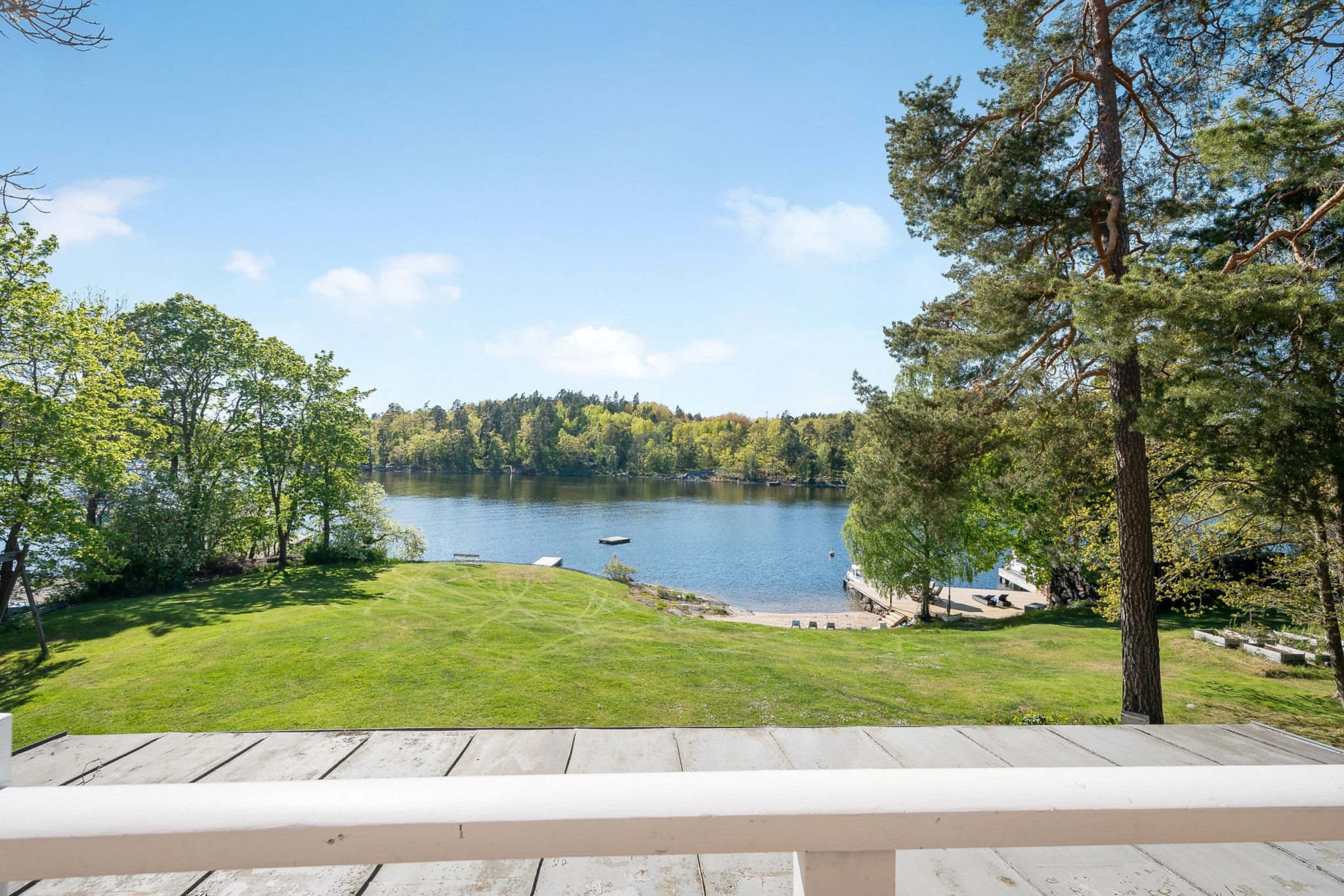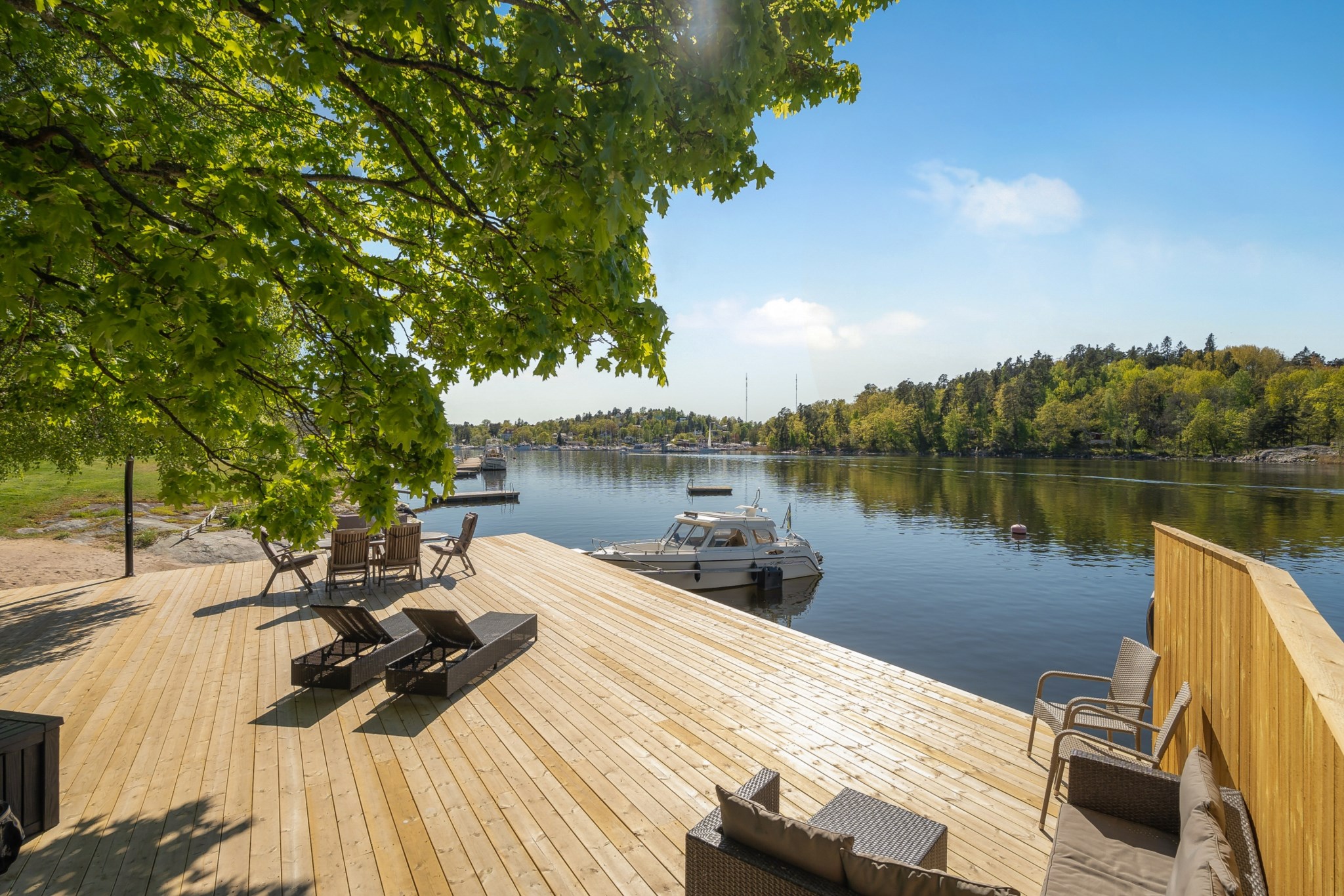 Gemensam stor uteplats på trädäcket nere vid vattnet.