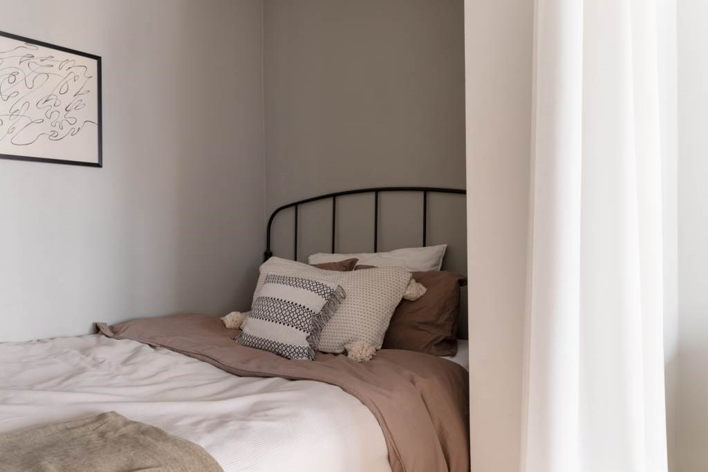 Avskild och rogivande sovdel i anslutning till vardagsrummet, med plats för en 160 cm bred säng. En lugn plats för vila.