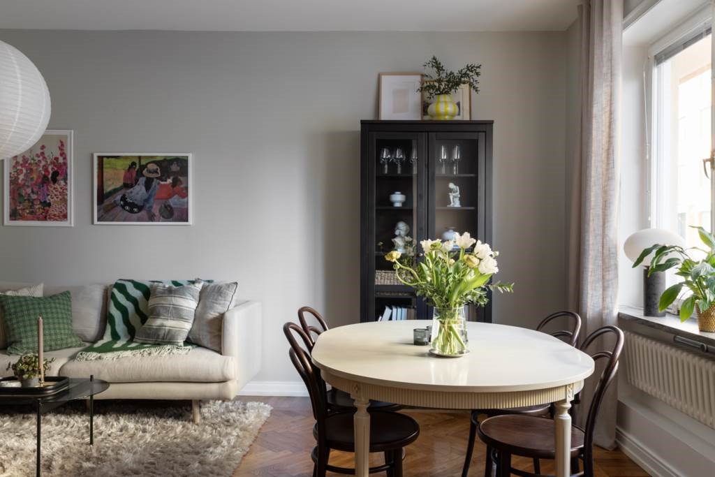 Ett ljust och lättmöblerat rum där det stora fönsterpartiet i originalstil bjuder in dagsljuset. Här finns plats för både soffgrupp och matsalsbord. En platsbyggd tv-bänk i samma utförande som köket skapar en enhetlig helhet och ger ytterligare förvaring.
