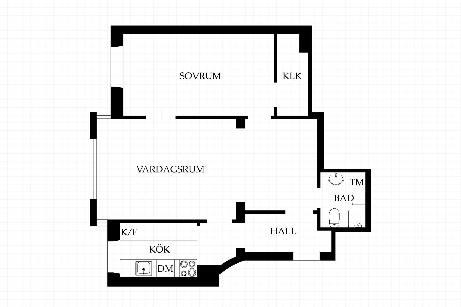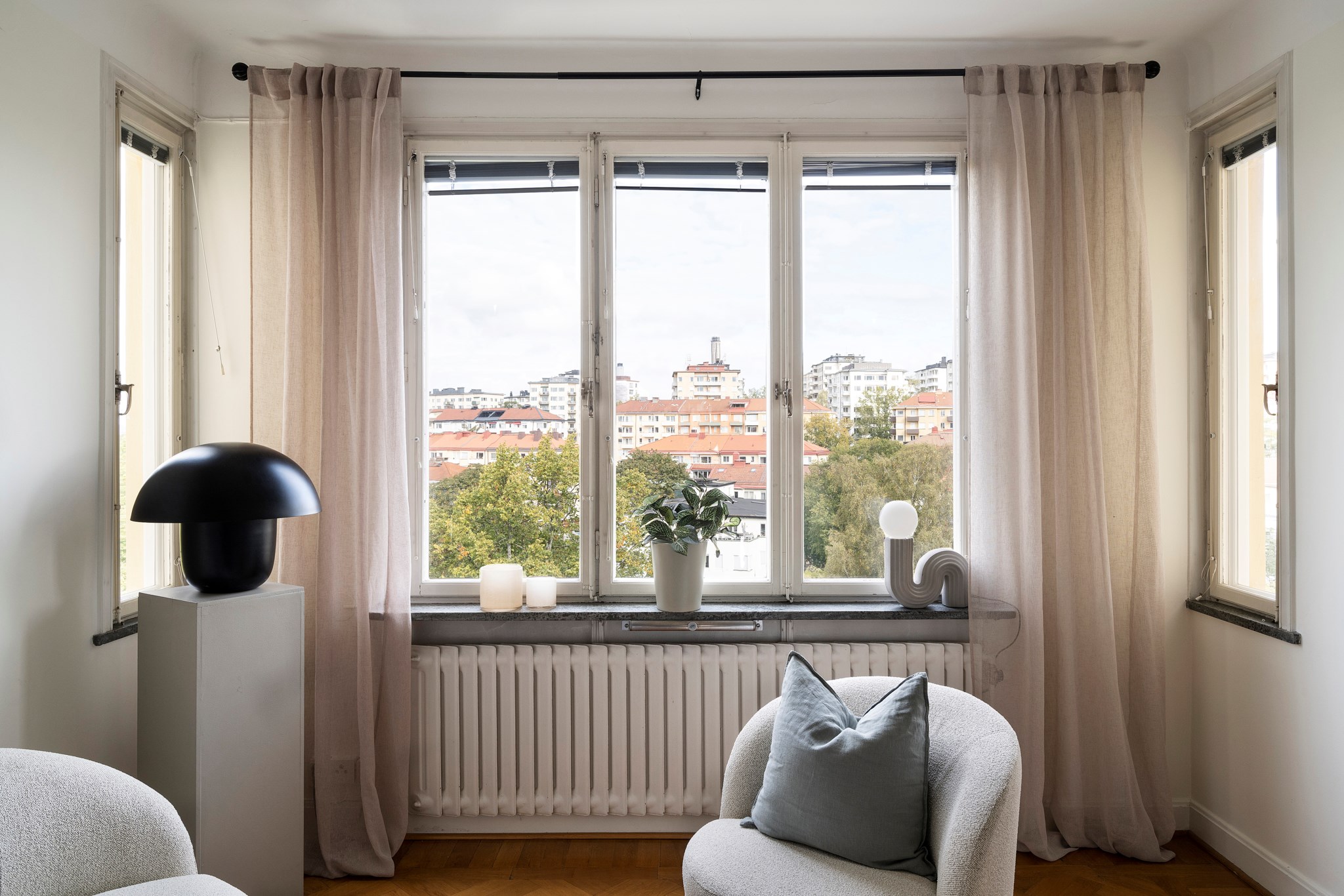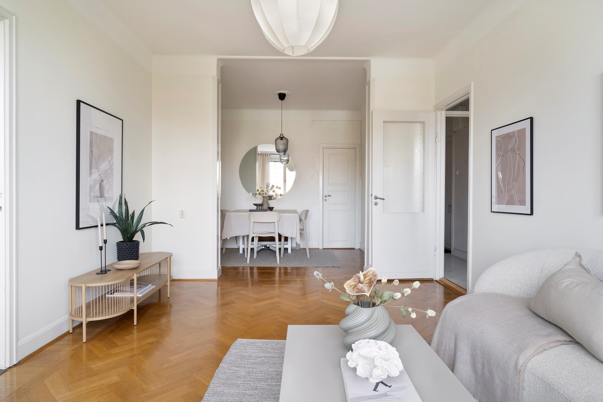 Ett vackert burspråk kröner vardagsrummet. Härifrån ser du ut över trädkronor och upp mot Gärdets kulle med sina fina funkishus. Rummet i sig är stort och luftigt med plats för såväl matbord som soffgrupp. Längst in finns en inre hall med ingång till sovrum, badrum och hall. På golvet ligger fiskbensparkett och väggarna är ljusa.