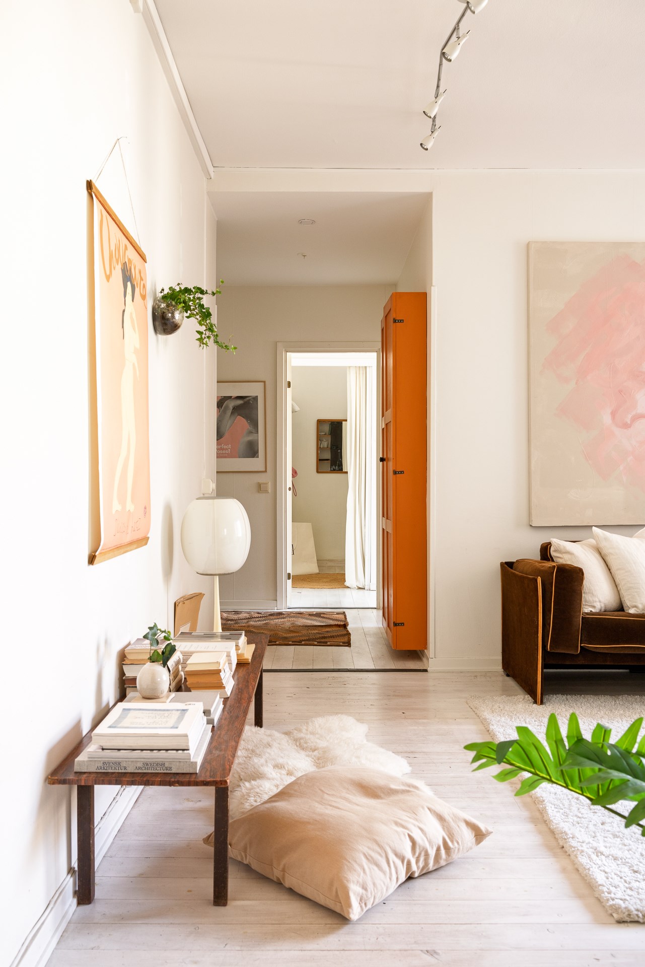 Välkomnande hall med goda avhängningsmöjligheter för ytterkläder och skor. Här finns plats för både hatthylla och kompletterande förvaring i garderober.