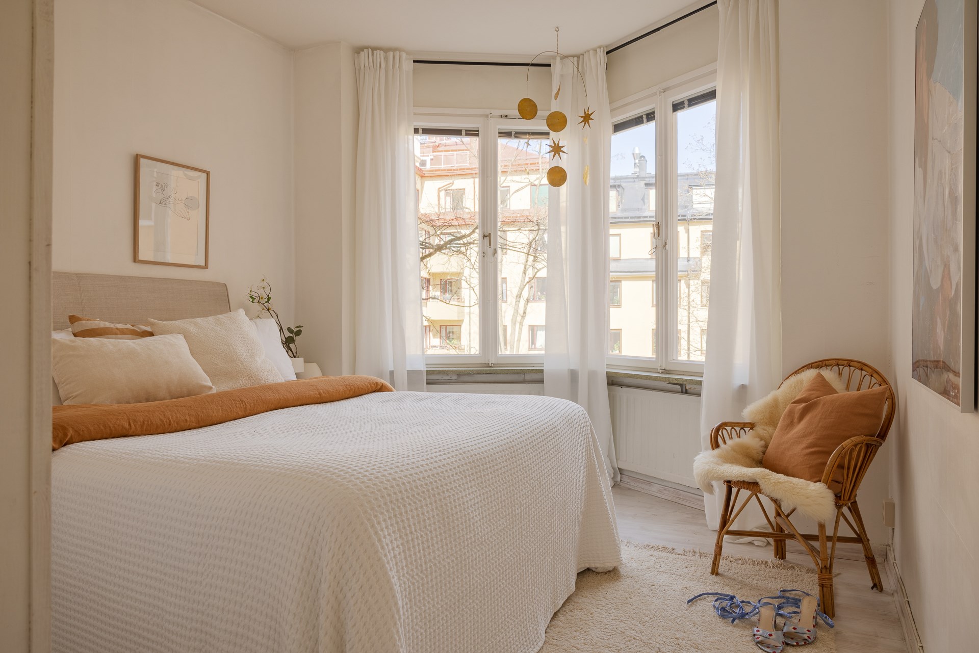 Det större sovrummet har ett vackert burspråksfönster som ger rummet karaktär och rymmer både dubbelsäng och förvaring. Därutöver finns ytterligare ett sovrum som lämpar sig väl som barnrum, gästrum eller arbetsrum. Hallen är välkomnande med plats för avhängning och förvaring, och badrummet är rymligt och praktiskt disponerat.