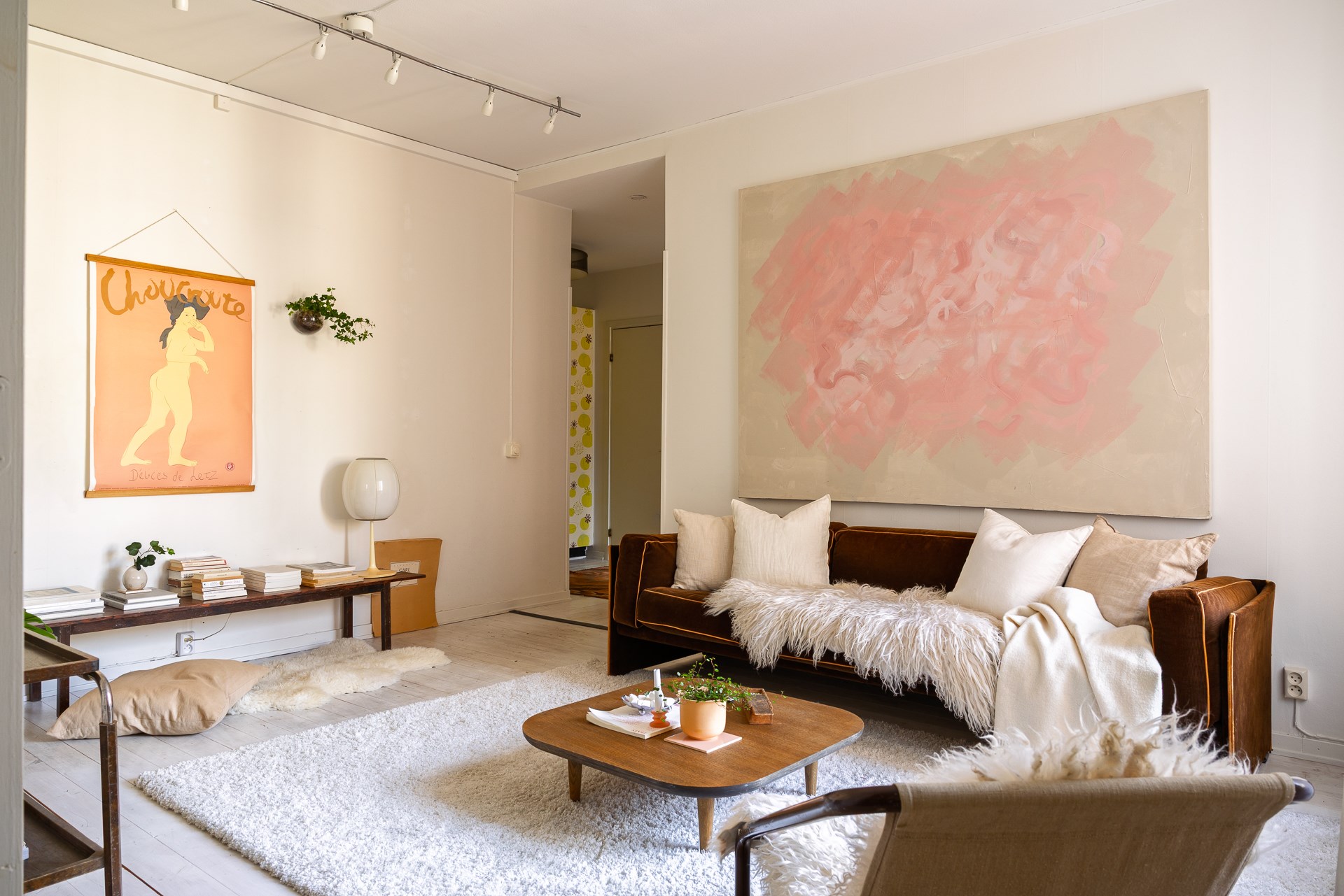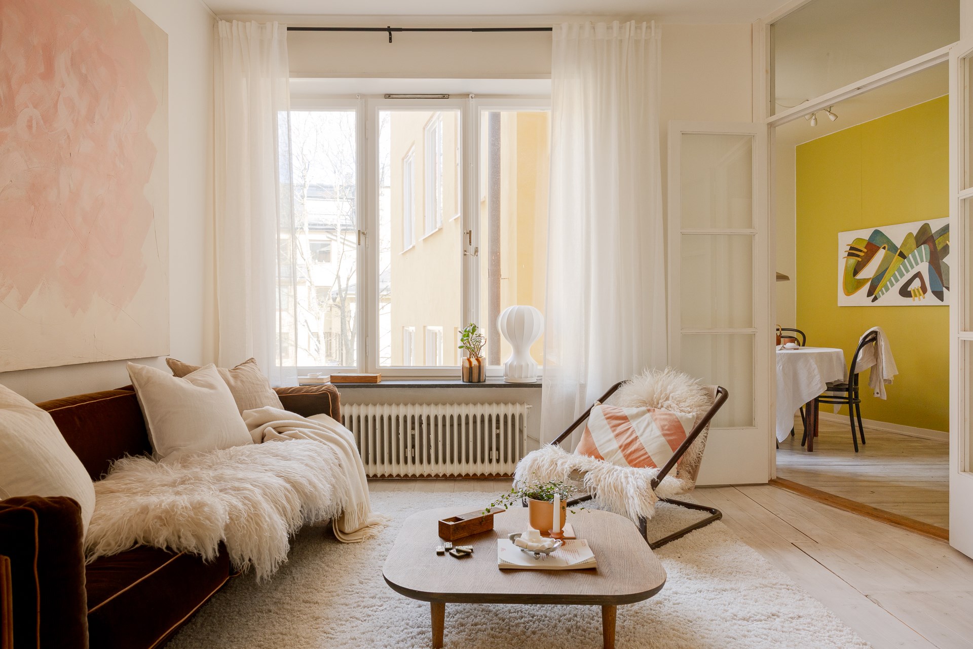 Ljust och luftigt vardagsrum med generöst ljusinsläpp från stort fönsterpartier mot lugn innergård. Rummet är lättmöblerat och rymmer såväl soffgrupp som mediamöbel och ytterligare möblemang efter behov.