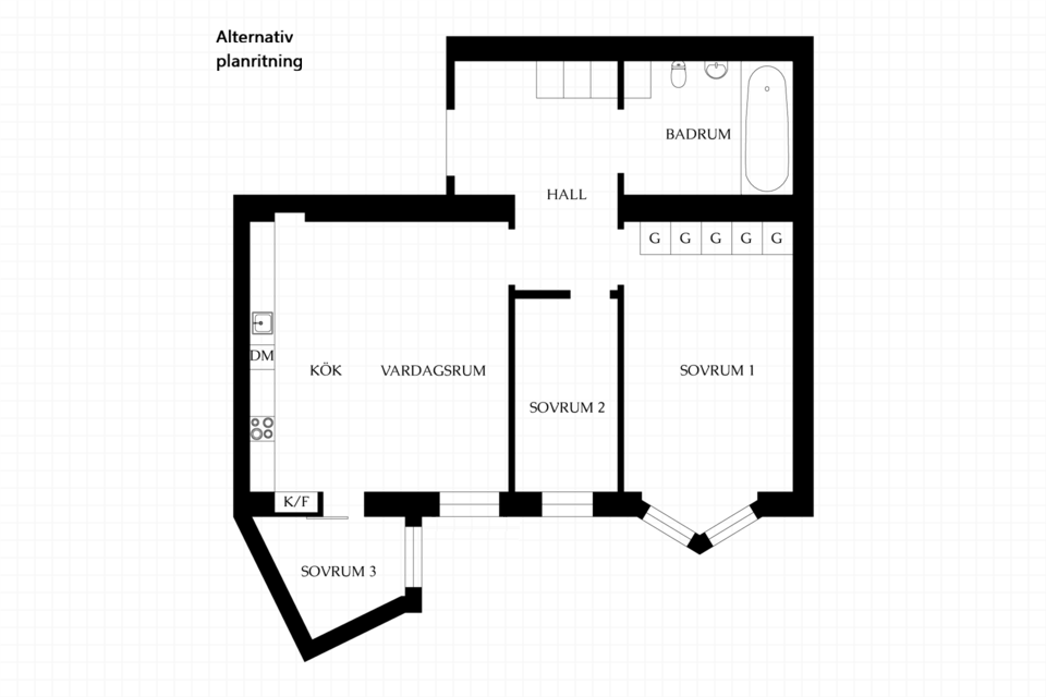 Planlösningen är klassisk och funktionell med tydligt avgränsade rum. Vardagsrummet är rymligt och lättmöblerat med plats för soffgrupp. Köket erbjuder bra arbetsytor och förvaring samt är utrustat med spishäll, ugn, diskmaskin och kyl/frys. Intill ligger ett separat matrum, som går att omvandla till ett tredje sovrum.