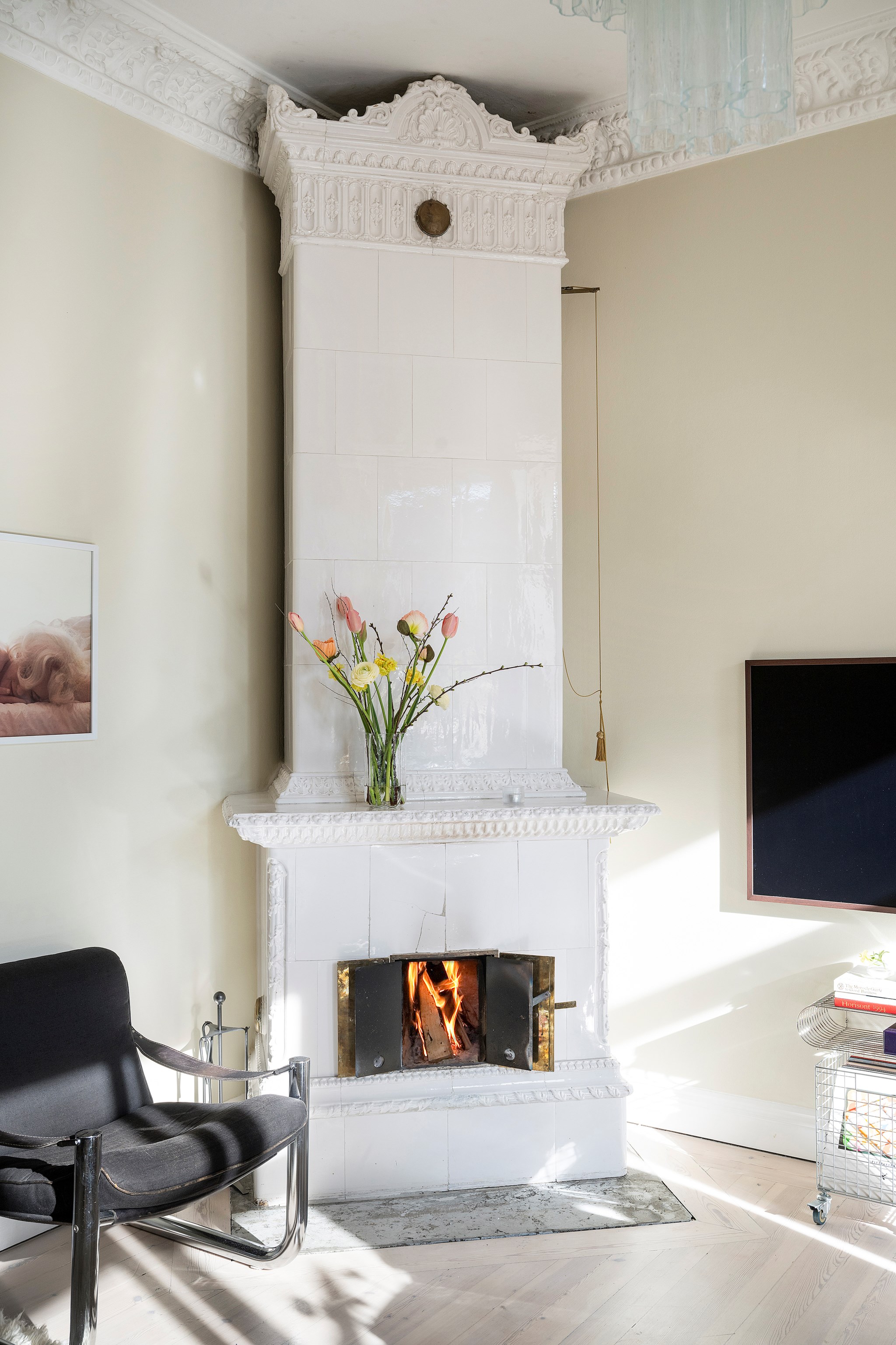 Ljust och lättmöblerat vardagsrum med plats för en större matgrupp för 6-10 personer, soffa, fåtöljer och mindre möblemang. Fantastiskt ljusflöde från två höga fönster som vetter ut mot Brännkyrkagatan. Den pampiga kakelugnen är inte bara vacker utan fungerar och ger ökad mysfaktor under årets kallare månader.