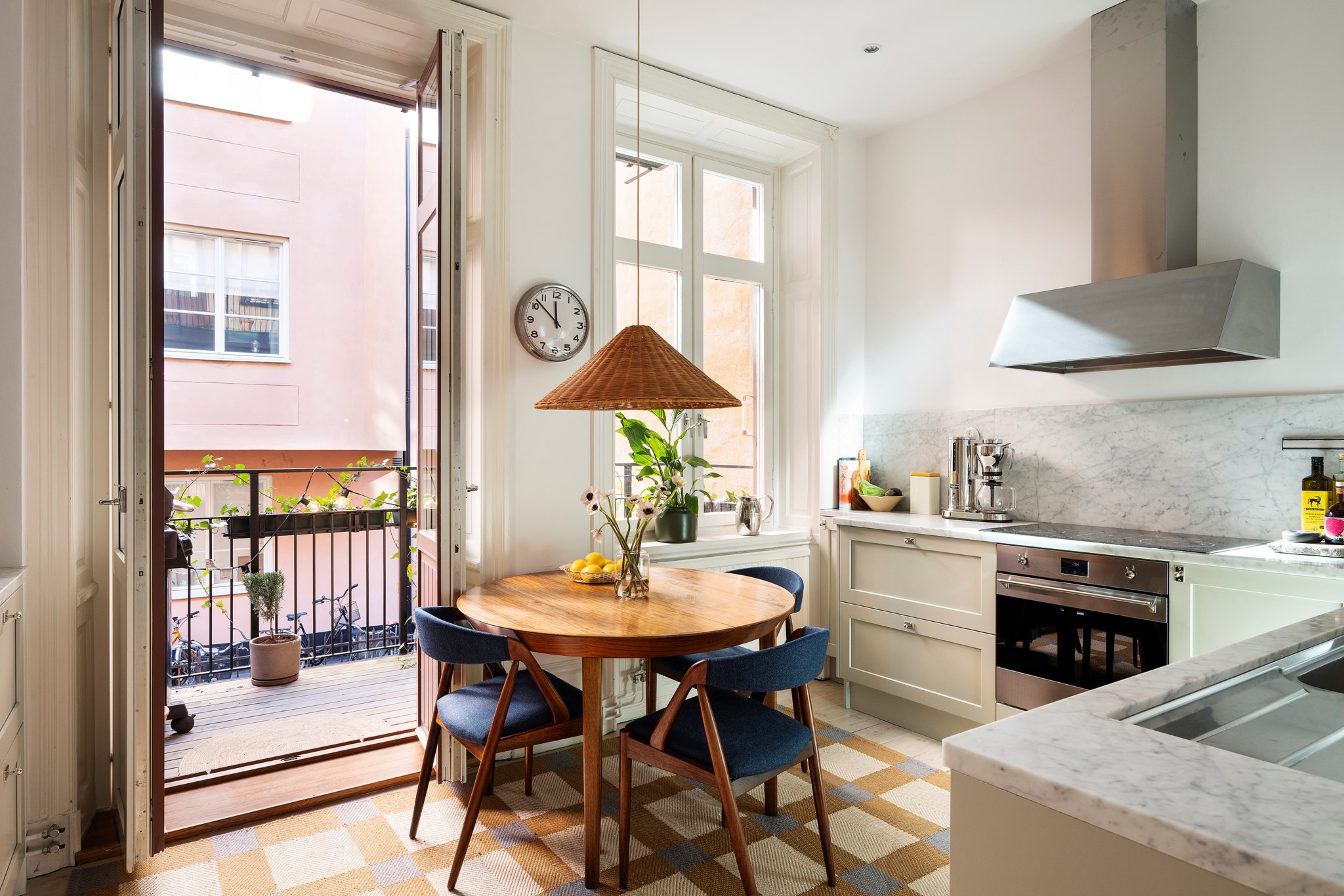 Snyggt och inspirerande kök med gott om arbetsyta på bänkskiva i marmor och mycket goda förvaringsmöjligheter bakom ljusbeiga luckor. Köket är utrustat med spis, ugn, kyl/frys, vinkyl, diskmaskin och tvättmaskin. Köket rymmer en matplats för 4 personer. Fint ljusflöde från stort fönster och från de helglasade pardörrarna ut till den stora balkongen.
