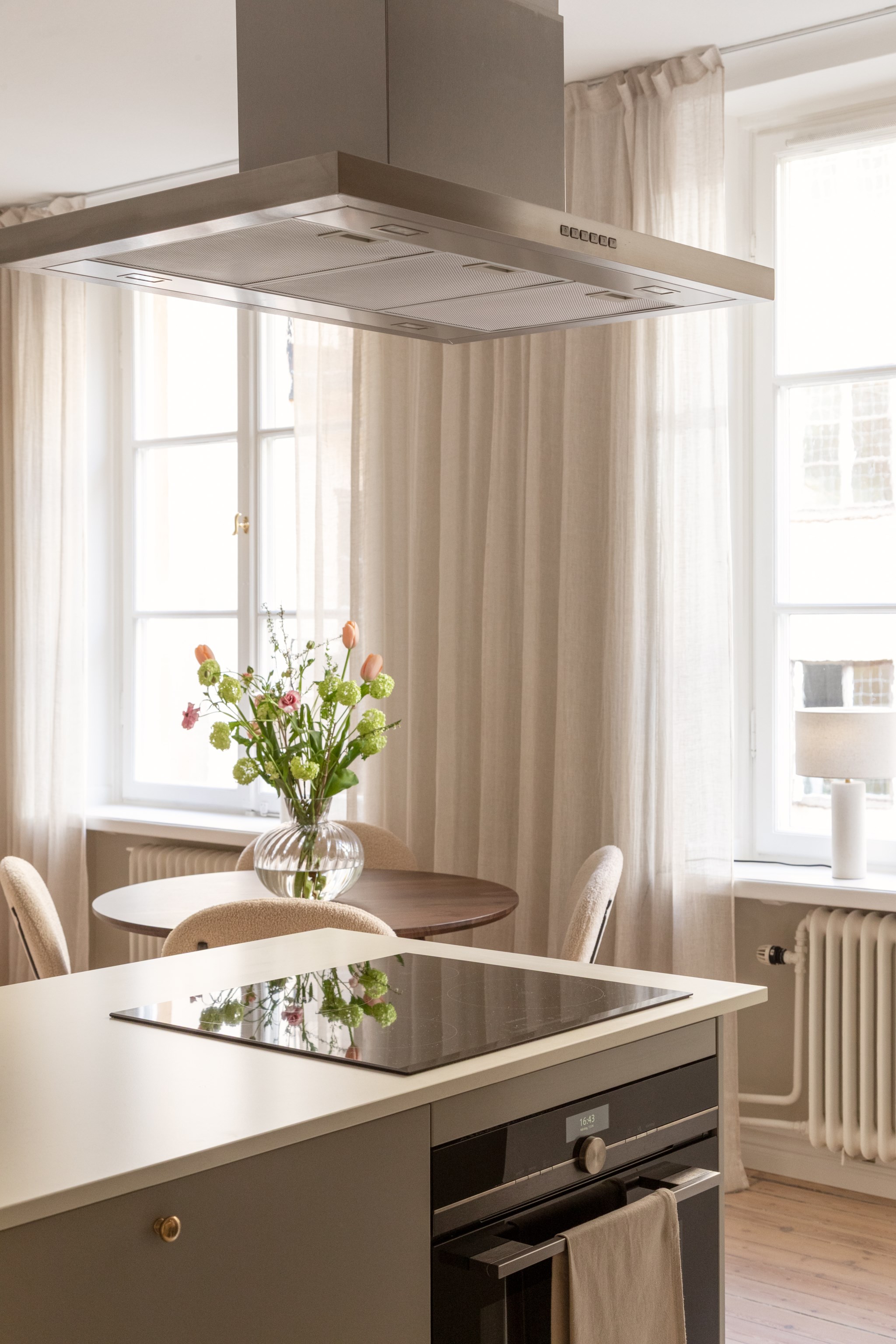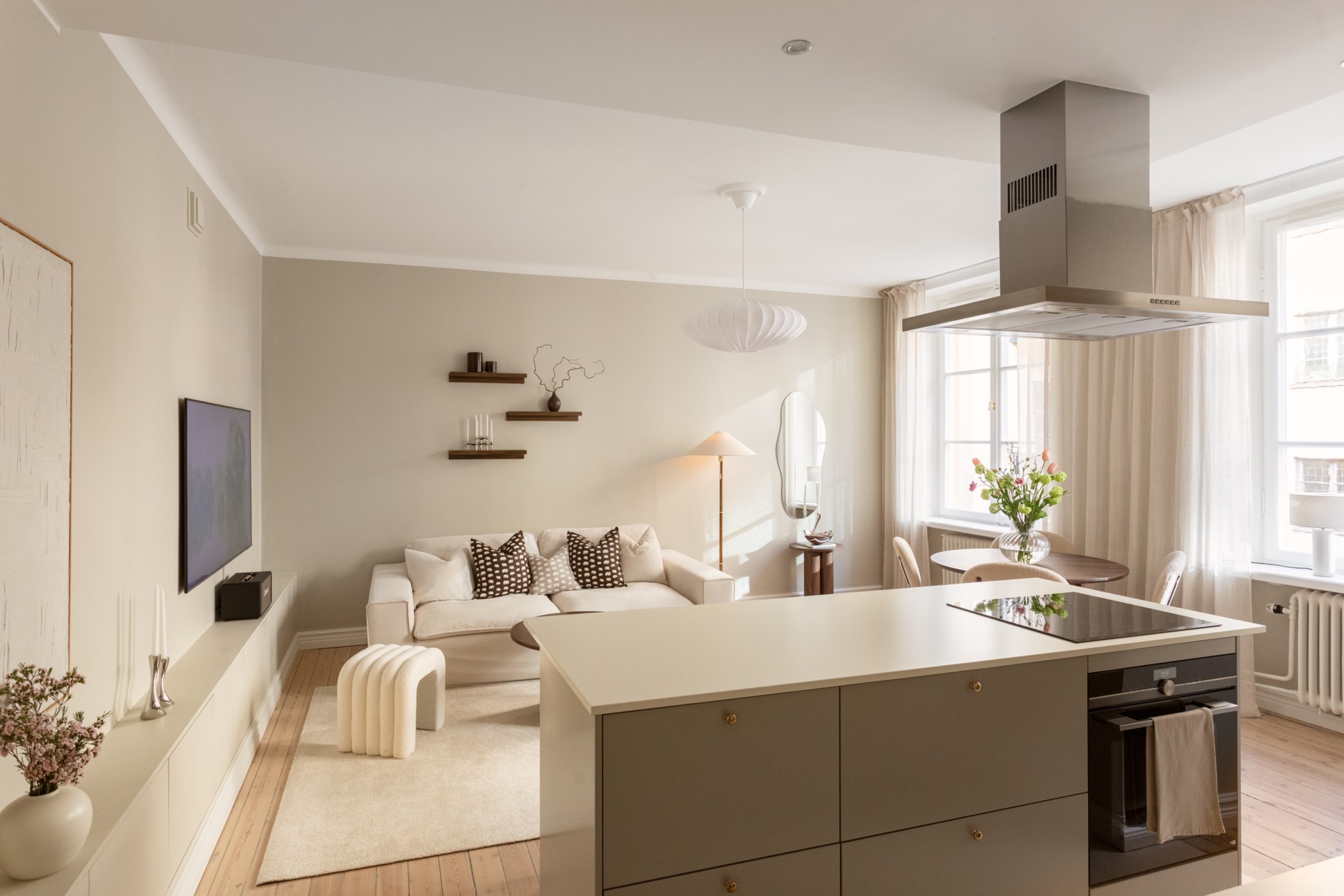 Välkomnande hall med klassisk hatthylla i original för avhängning samt förvaringsmöjligheter. Kök och vardagsrum i en öppen och sällskapsvänlig planlösning, perfekt för både matlagning och sociala tillställningar. Köket från Ballingslöv i greige med tillhörande köksö är välutrustat med bänkskivor och avställningsytor i ljus sten, inbyggd kyl och frys, induktionshäll, fläkt, vask med utdragbar vattenkran, diskmaskin och kombinerad ugn och mikro.