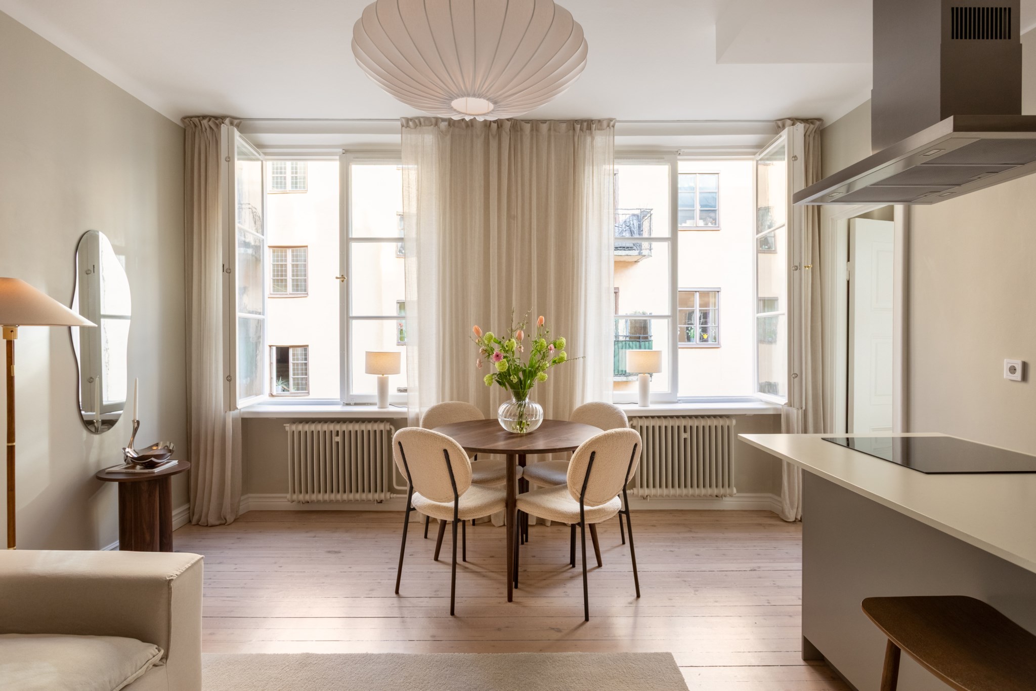 Vardagsrum med dubbla fönsterpartier mot gården med plats för såväl soffgrupp som matplats. Längs väggen i vardagsrummet finns generös plats för TV och platsbyggd dold förvaring som täcker sladdar och uttag. Tyst och rofyllt sovrum med plats för 160 cm säng, garderob och förvaring. Rymligt badrum med klinkergolv och golvvärme, stor spegel, handfat på kommod med förvaring och tvättmaskin, handdukstork, vägghängd toalett samt duschhörna med både hand- och takdusch.