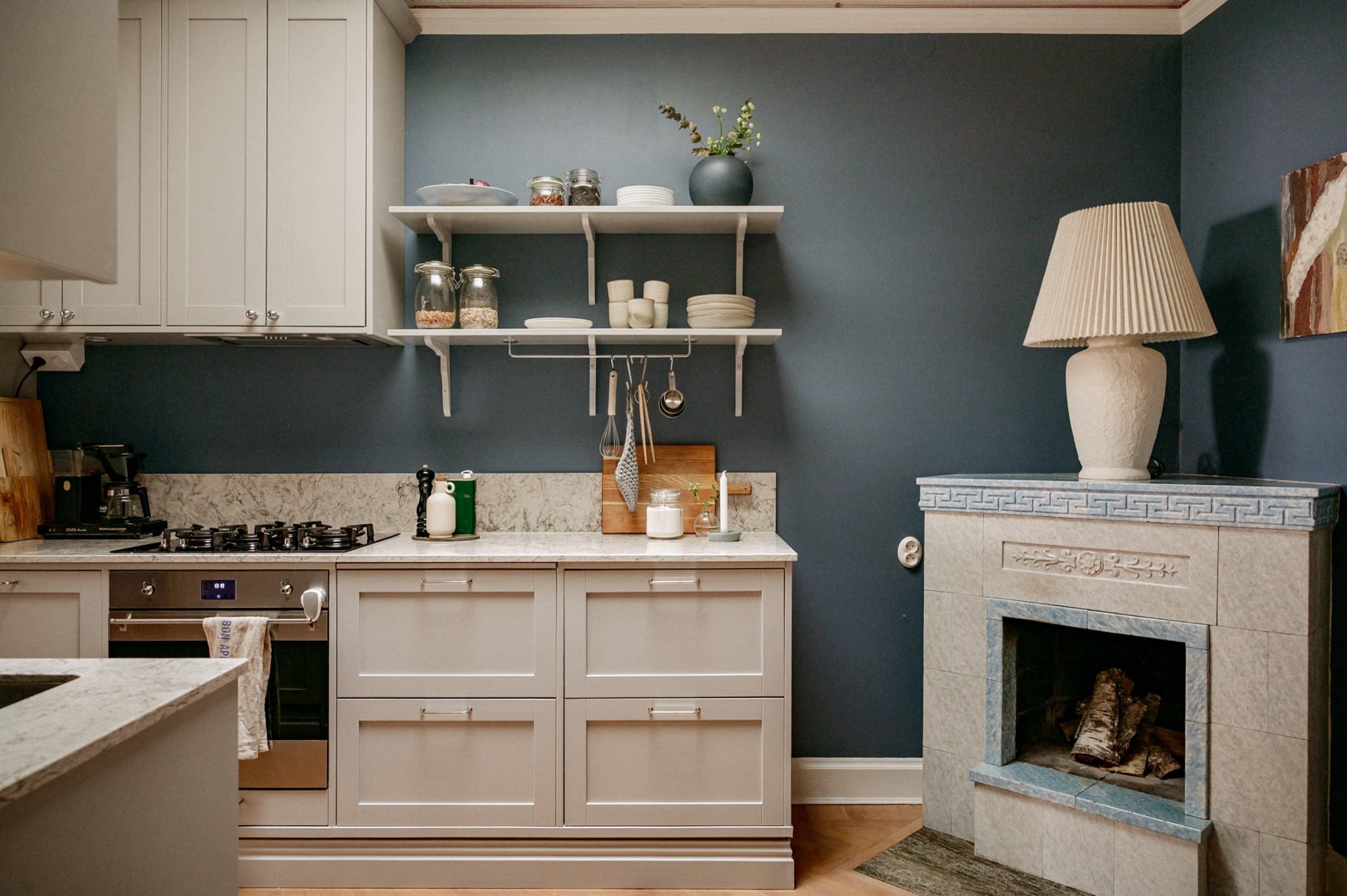 Förutom i badrum är lägenheten genomgående klädd med klassisk fiskbensparkett, vilket skapar ett enhetligt intryck.