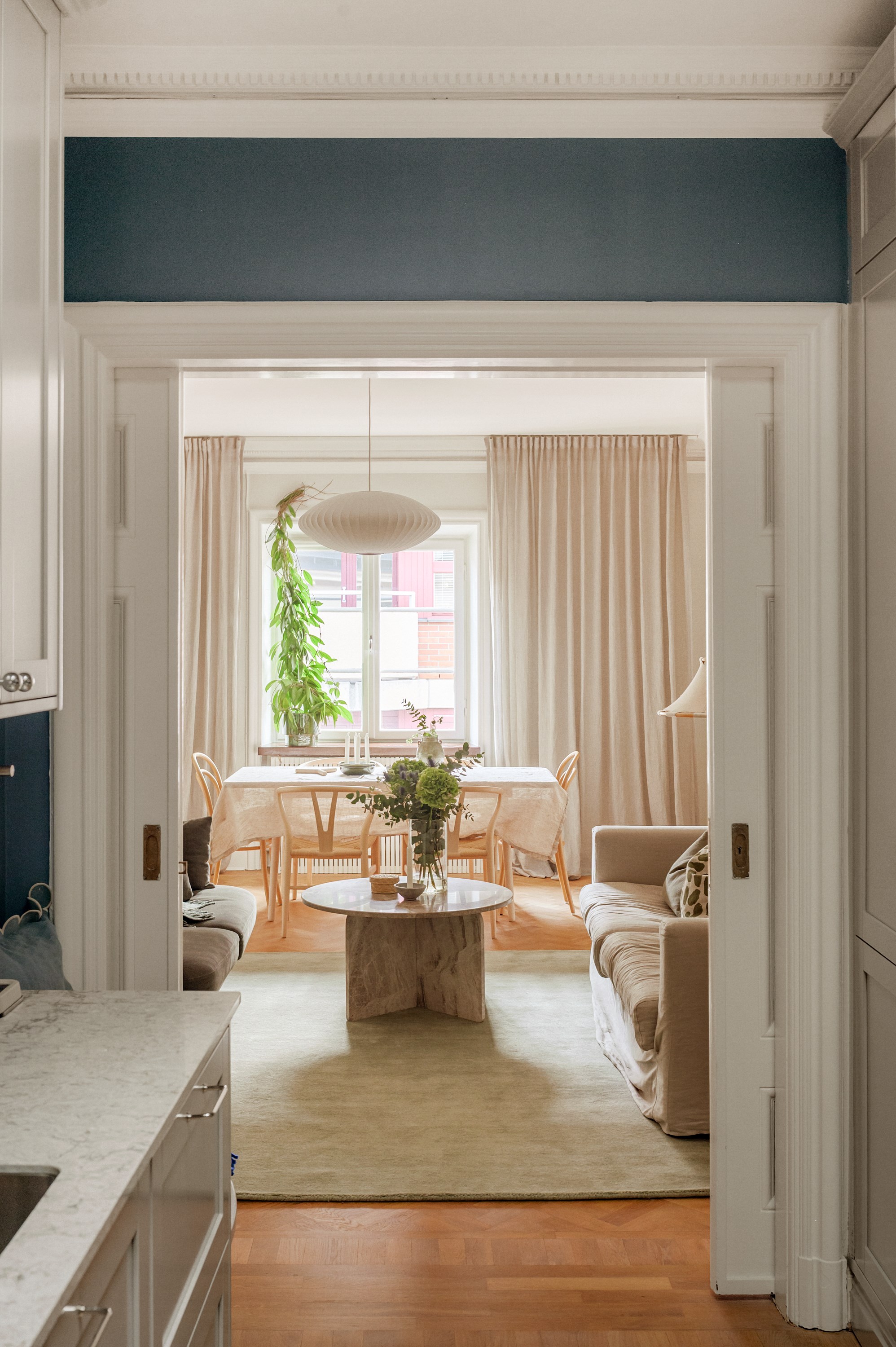 - Lättmöblerat vardagsrum med fiskbensparkett, slätstuckatur och ett stort spröjsat fönster. Vacker skjutdörr till köket.