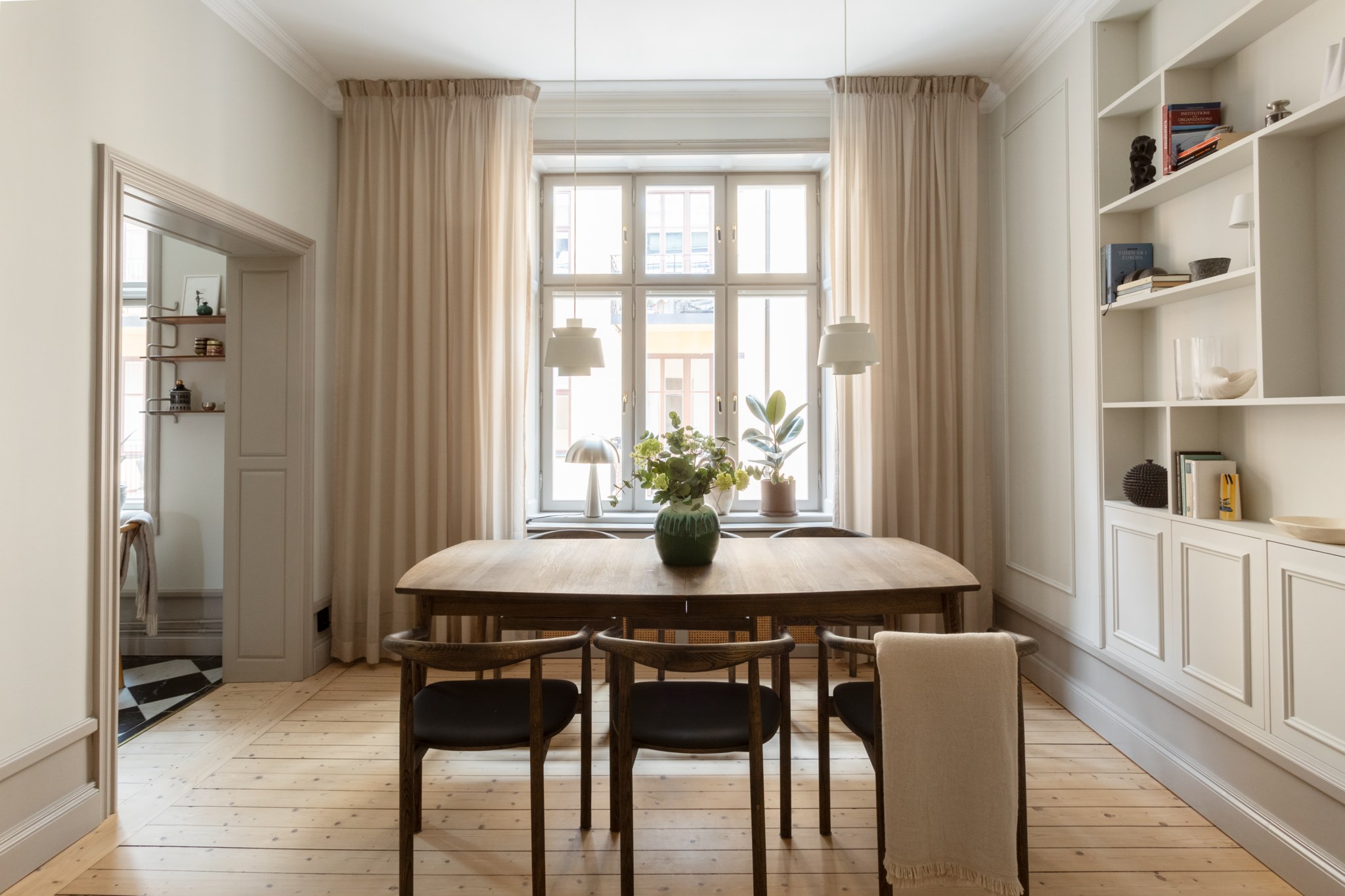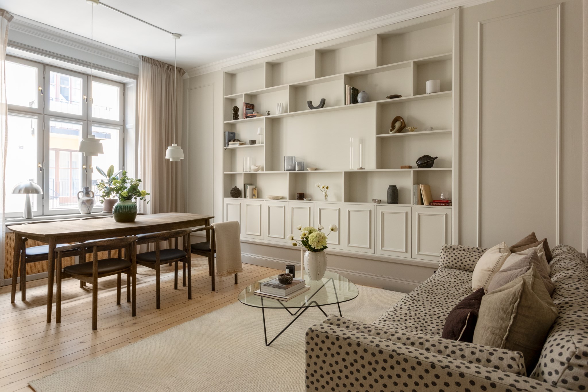 Lägenheten totalrenoverades i samband med stambytet 2018 och håller genomgående mycket hög standard med smakfulla färg- och materialval. Generös takhöjd, vackra originaldörrar och höga fönster sätter tonen. I vardagsrummet sträcker sig en platsbyggd bokhylla längs väggen och här finns plats för stort marbord, soffa och fåtöljer. Från det större sovrummet nås den fantastiska balkongen i sydvästläge, med utsikt mot takåsar och gårdar – en stillsam plats för eftermiddagssol och kvällsljus.