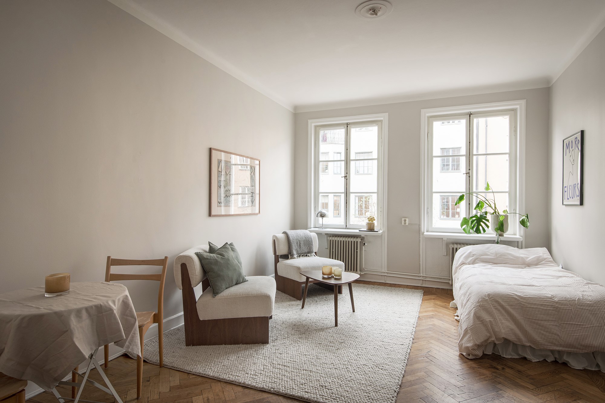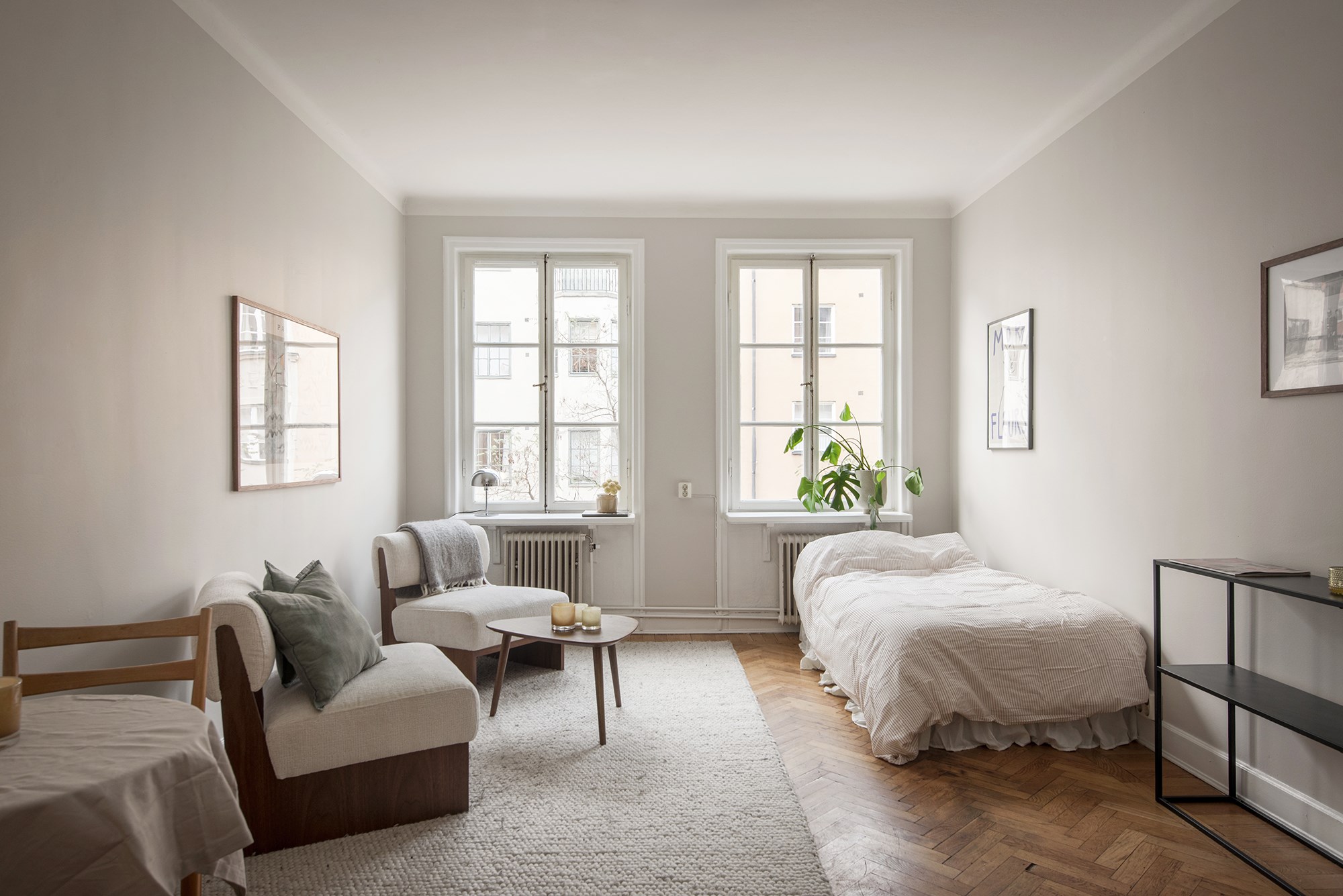 Ljust och luftigt allrum två stora och spröjsade fönsterpartier som genererar ett fint ljusinsläpp till hel lägenheten. Rummet har öppen planlösning mot köket vilket ger en härlig känsla av ryms. Här finns gott om plats för större säng, matplats, soffa och övrig möblering. På golvet ligger original fiskbensparkett.