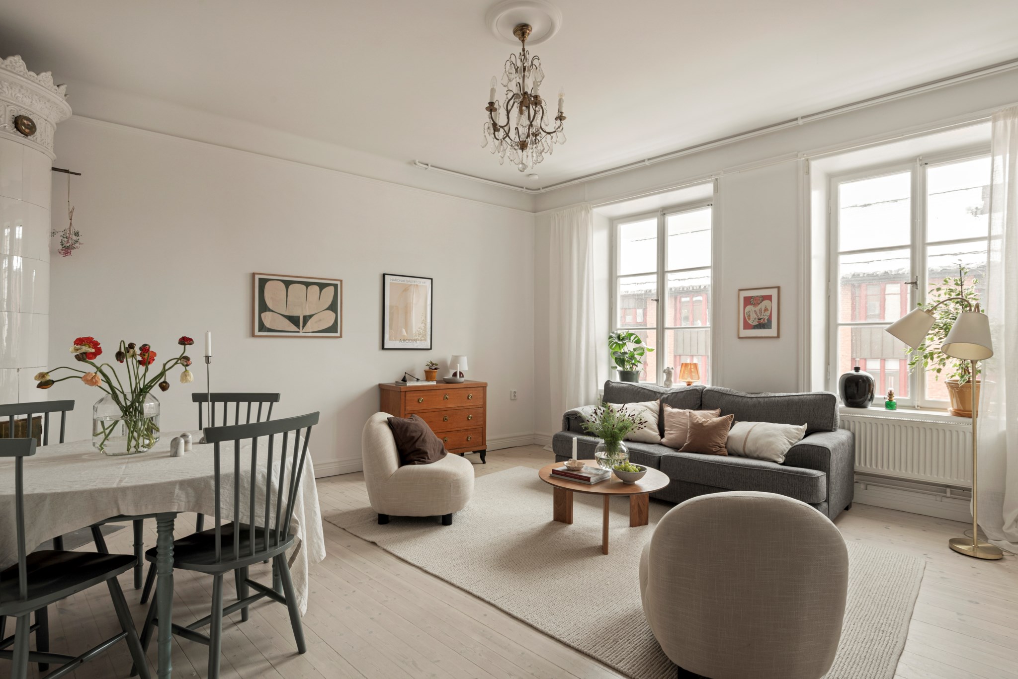 Fullkomligt magiskt rum där du direkt slås av det underbara ljusinsläppet från två höga fönster med djupa nischer. Den öppna och sociala planlösningen mot det stilfulla köket skapar en otrolig rymdkänsla och blir den perfekta ytan för mingel och större middagsbjudningar. Här finns det gott om utrymme för större soffgrupp, tv-möbel, bokhyllor, sideboard och matsalsbord för många middagsgäster. I rummets ena hörn finns en vacker utsmyckad kakelugn (ej fungerande i dagsläget)