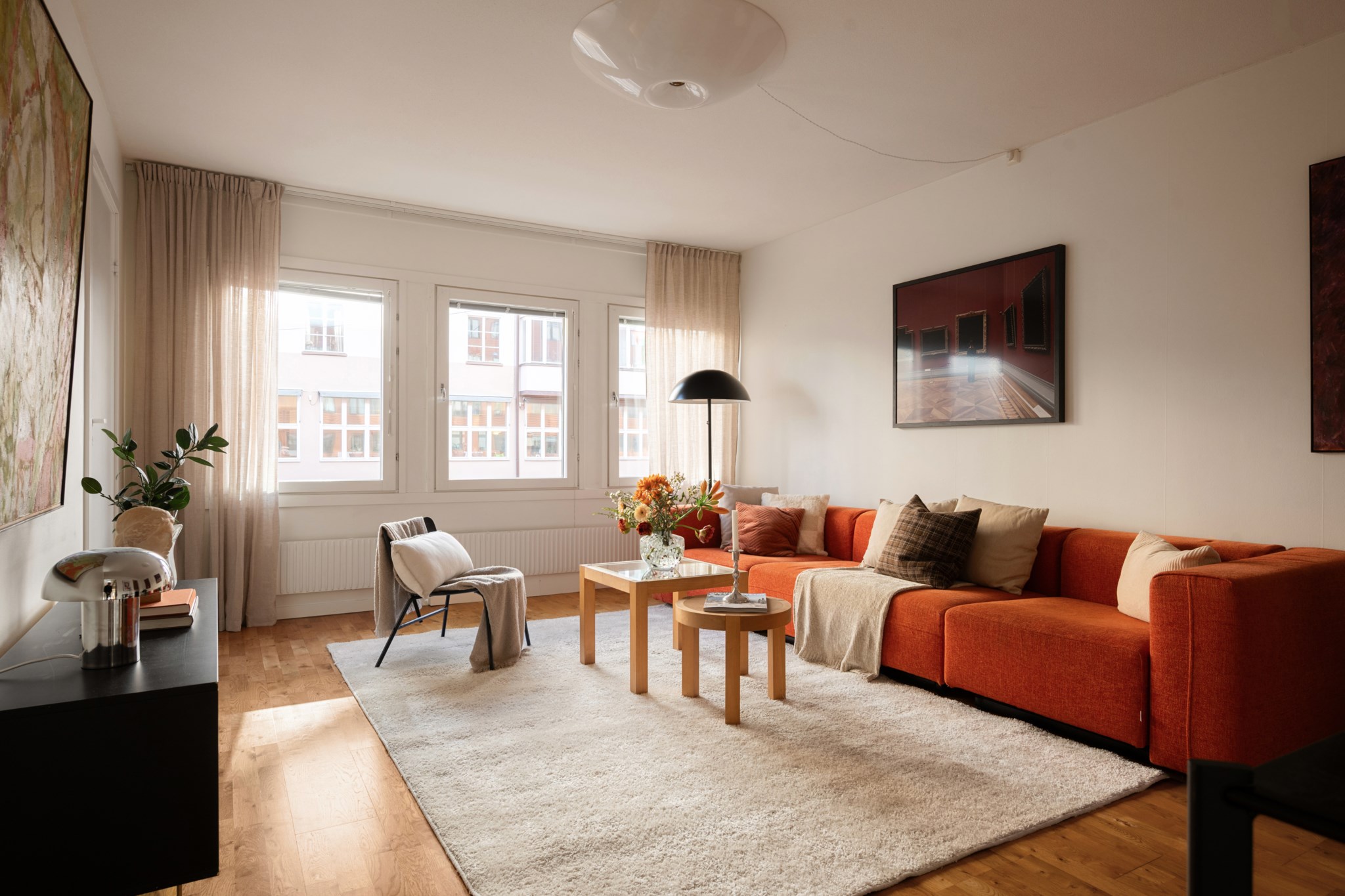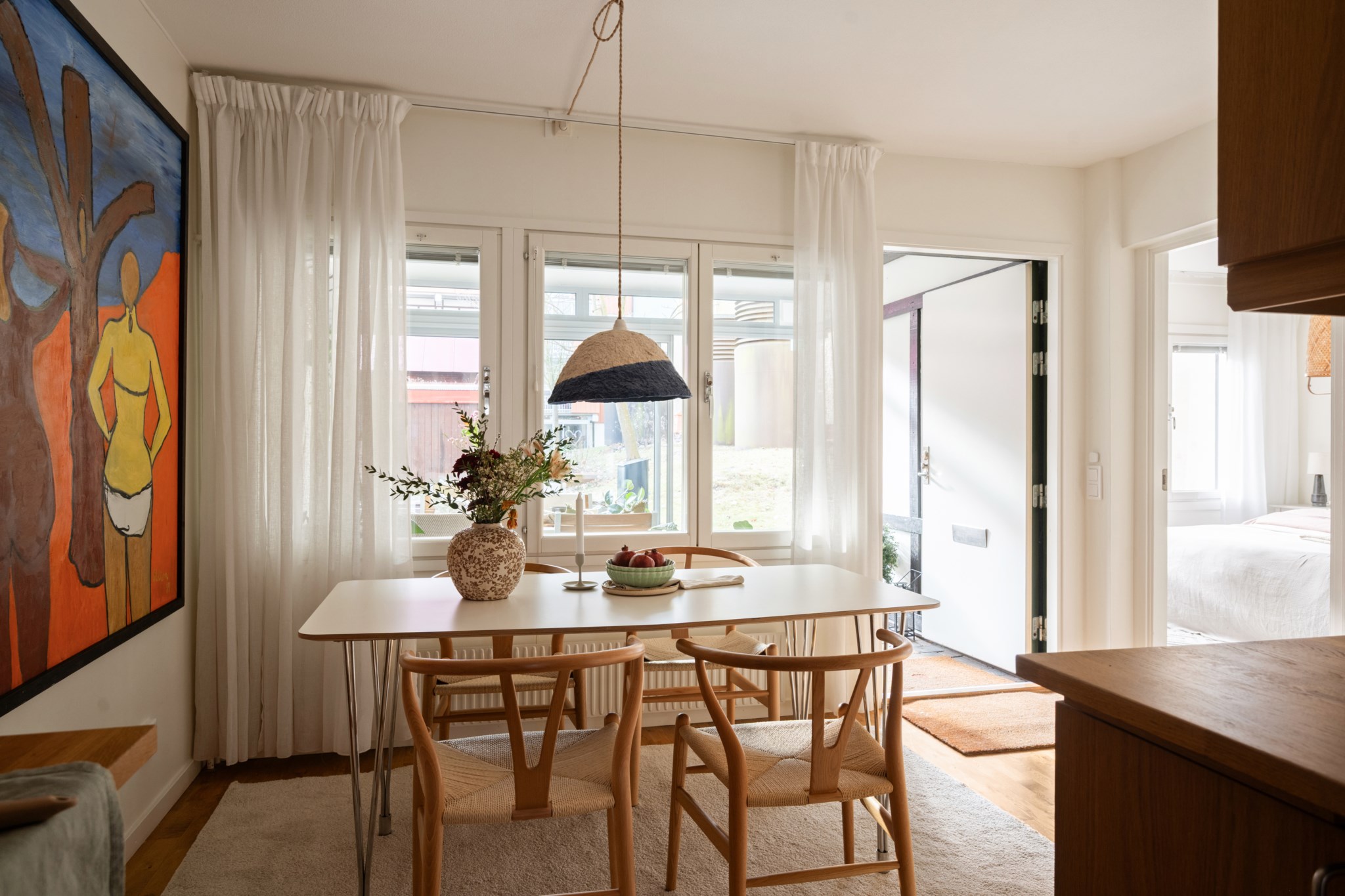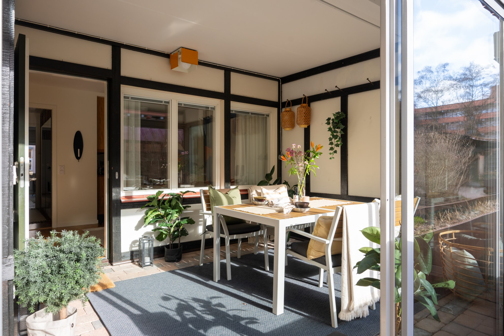 Den genomgående planlösningen i gavelläge med stora fönsterpartier bidrar till att maximera ljusflödet. Vidare erbjuds interiört generösa sociala ytor med stort vardagsrum, kök med rymlig matplats, ett stort och rogivande sovrum samt ytterligare två mindre men väldisponerade sovrum varav det ena får ljusinläpp via överfönster. Det rymliga och fräscha badrummet renoverades 2021. Gott om förvaringsutrymmen i både sovrum och hall. Ytterligare förvaringsutrymme finns i förråd i anslutning till badrum där det är förberett för tvättmaskin om man önskar nyttja utrymmet som tvättstuga istället.