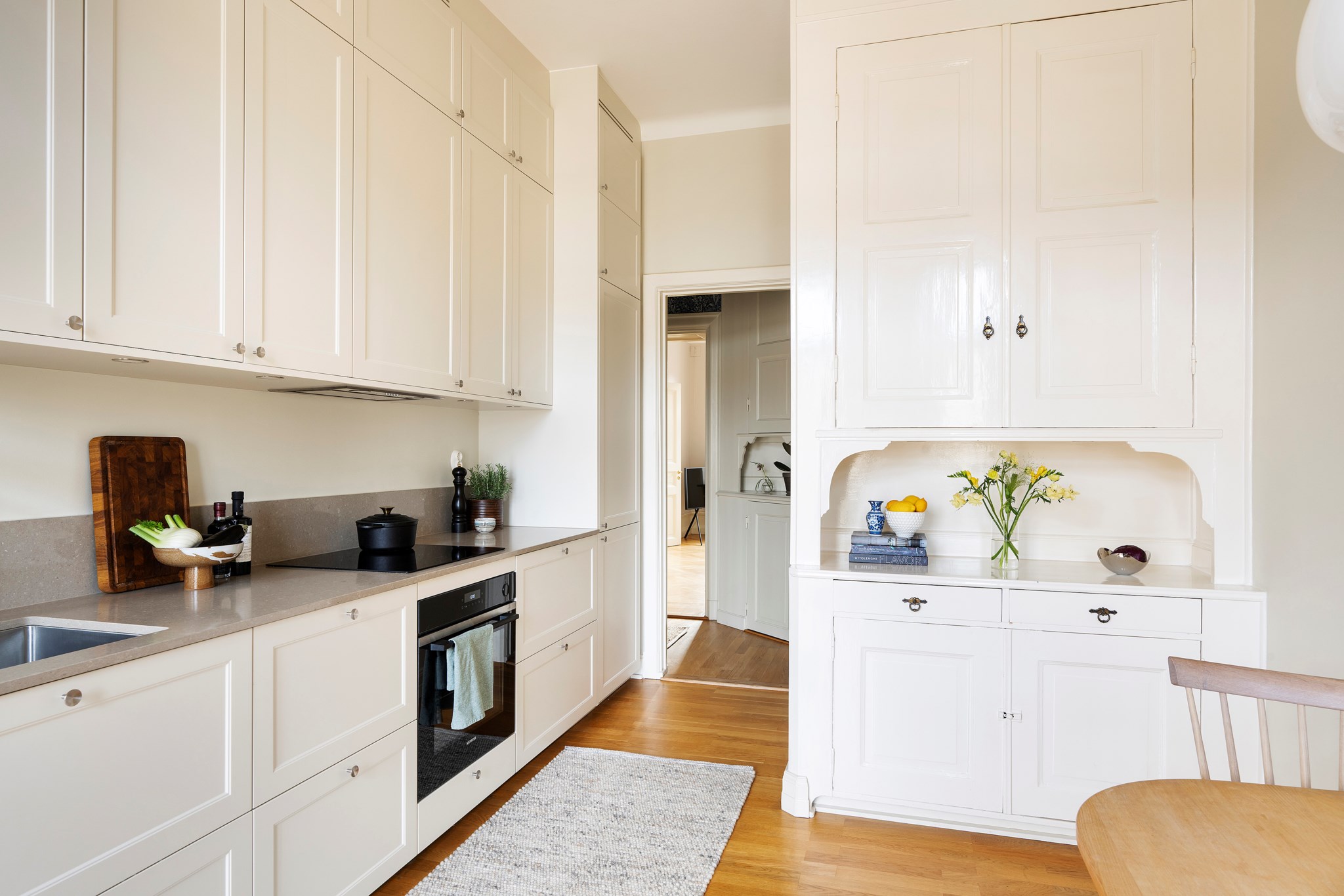 Stilrent, nyrenoverat kök från 2025 där moderna materialval möter det charmiga originalsnickeriet i serveringsskåpet. Generösa arbetsytor och rymlig förvaring. Maskinellt utrustat med spis och ugn, diskmaskin, fläkt, diskho samt kyl och frys. Här finns även plats för matbord, och från köket nås bostadens balkong mot innergård.