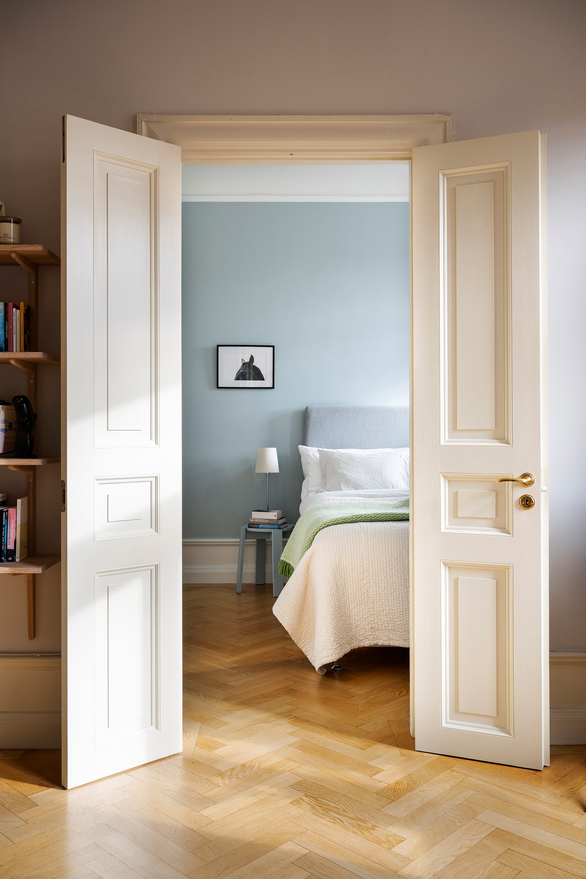 De höga fönsterpartierna och takhöjden om strax över tre meter skapar en luftig rymd där ljuset får flöda genom bostaden. Fiskbensparkett, speglade dörrar och tidstypiska detaljer förstärker sekelskifteskänslan och ger bostaden en elegant, levande atmosfär.
