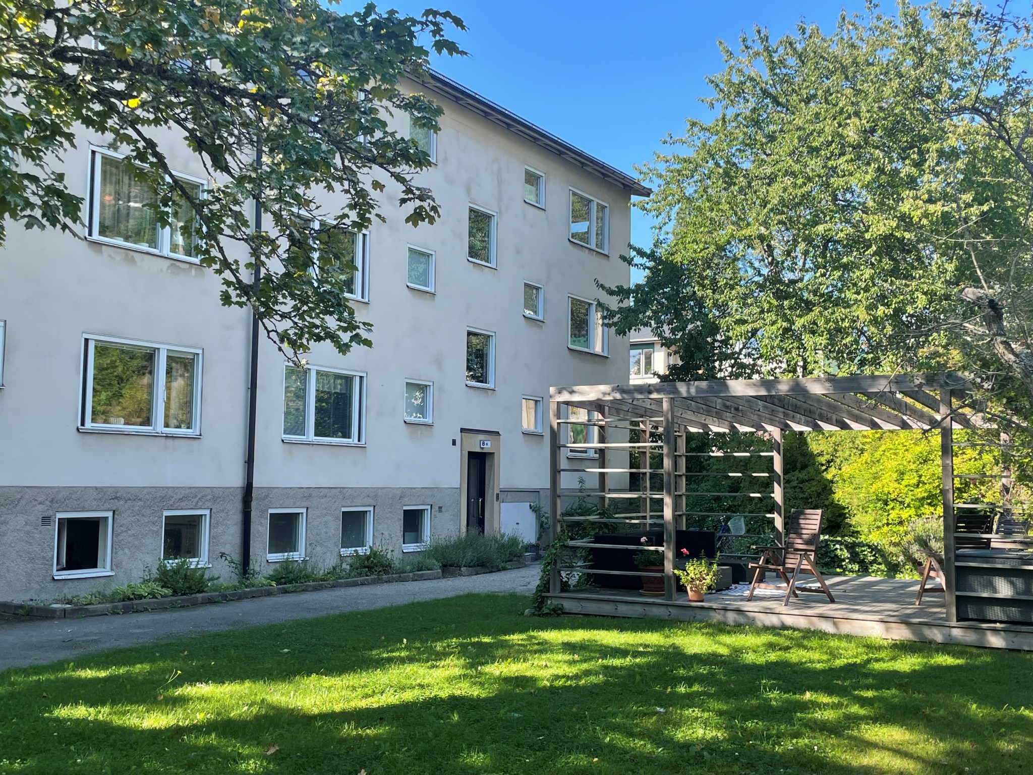 Bostaden erbjuder nyrenoverat kök (2025) med matplats och originalserveringsskåp, rymligt vardagsrum med utgång till balkongen, sovrum i rofyllt läge samt helkaklat badrum (stambytt 2023). Mycket välskött förening med låg belåning, gemensam uteplats med pergola, förråd, tvättstuga och parkering till låg kostnad.