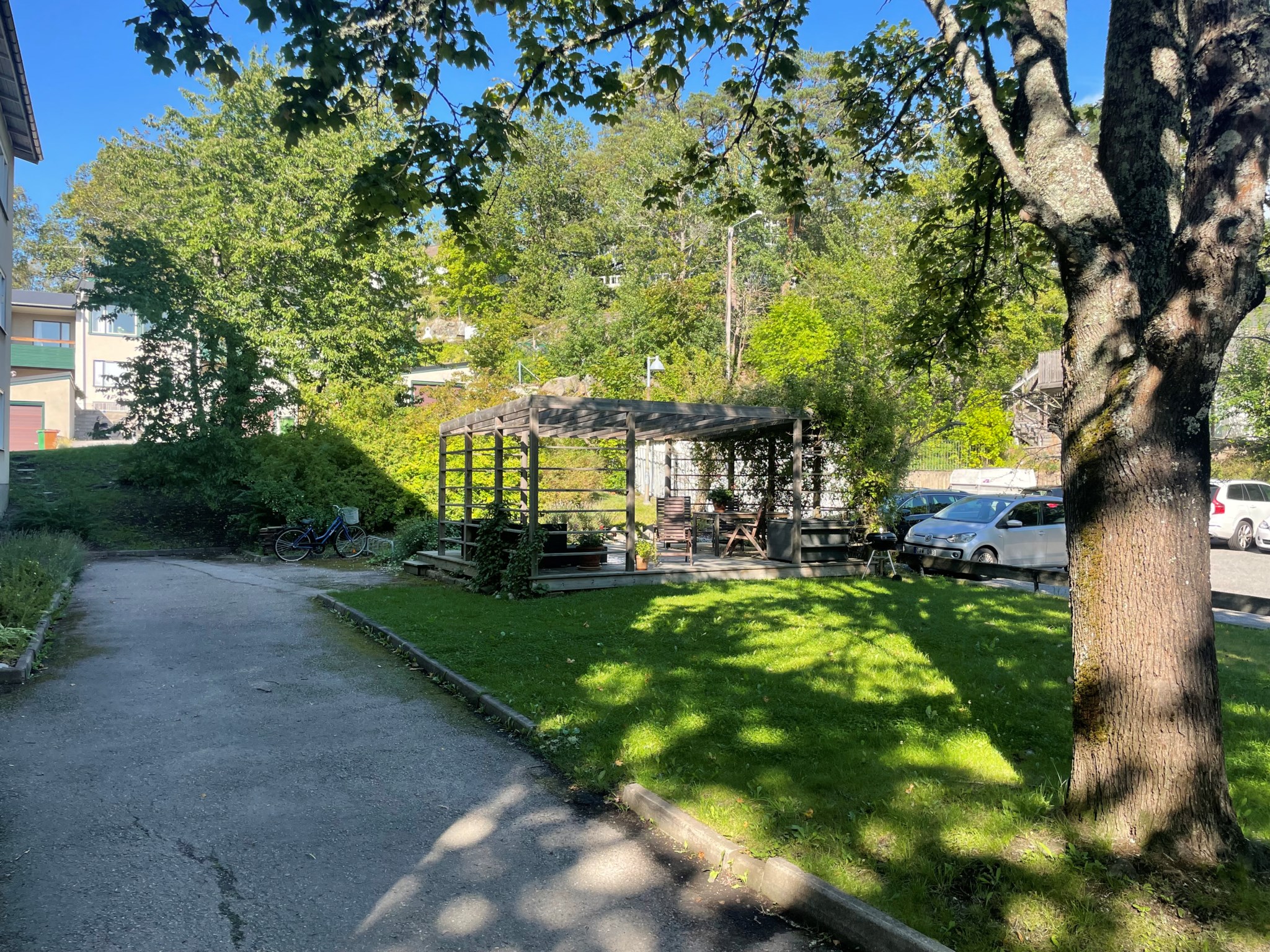 Föreningen äger marken runt huset och har gjort en fin uteplats i en pergola och en parkering till de boende.