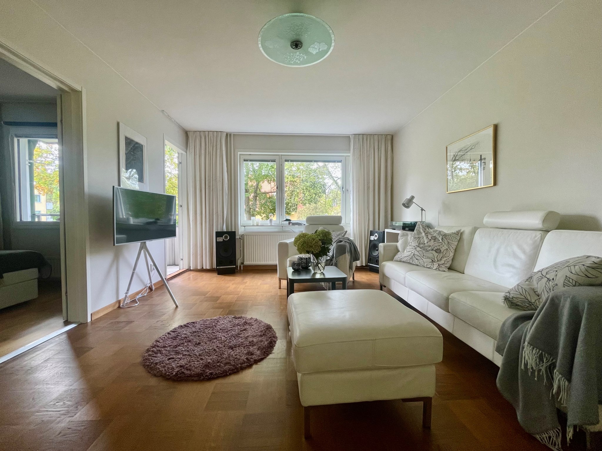 Ljust och rymligt vardagsrum med plats för både soffgrupp och matsalsbord. Utgång till bostadens balkong i västerläge med härlig utsikt över gräsmatta, björk och de intilliggande sekelskiftesvillorna.