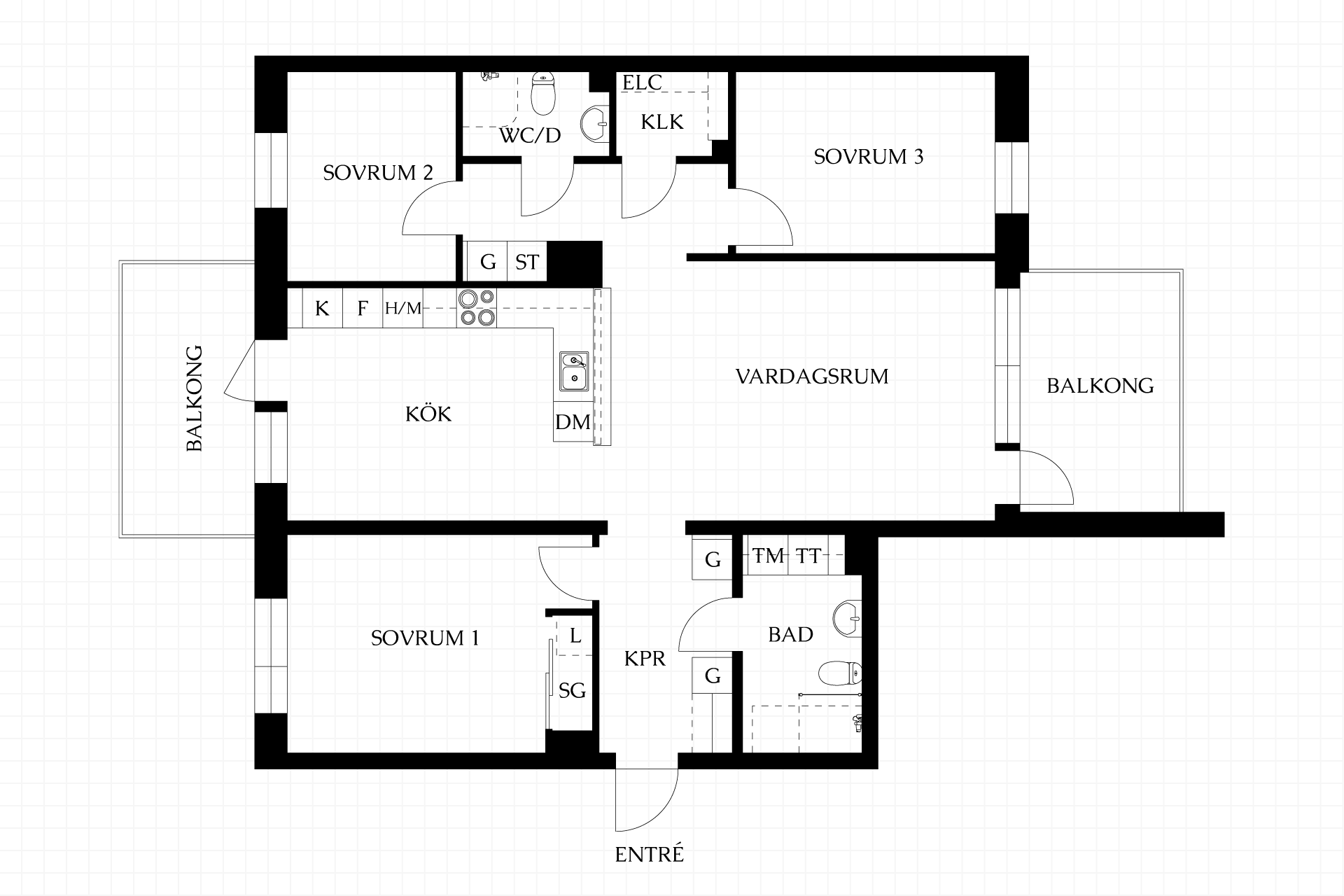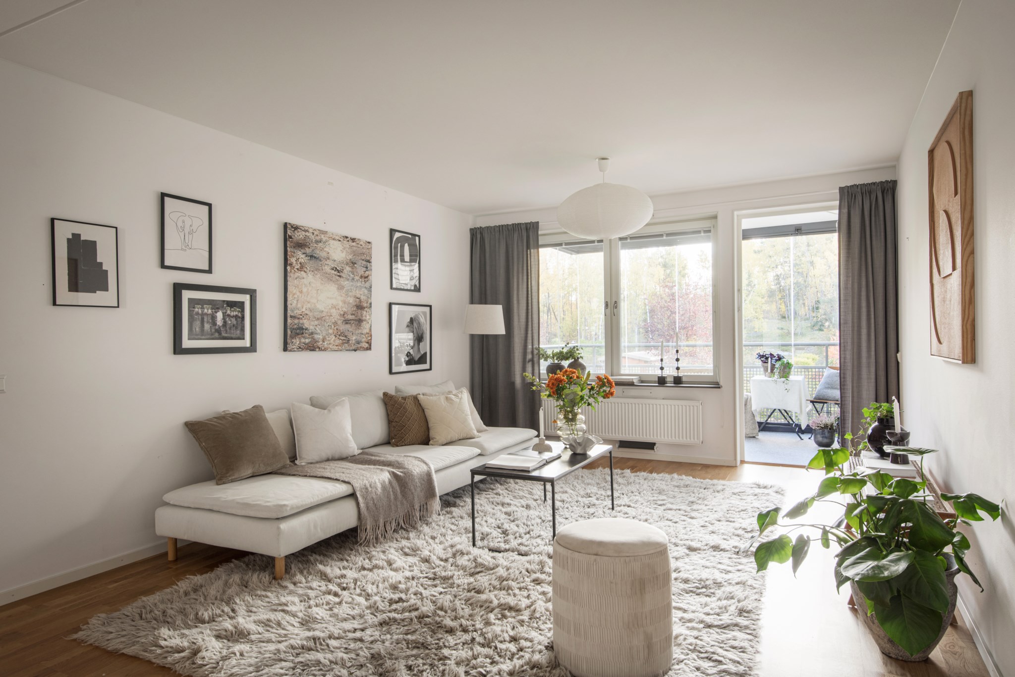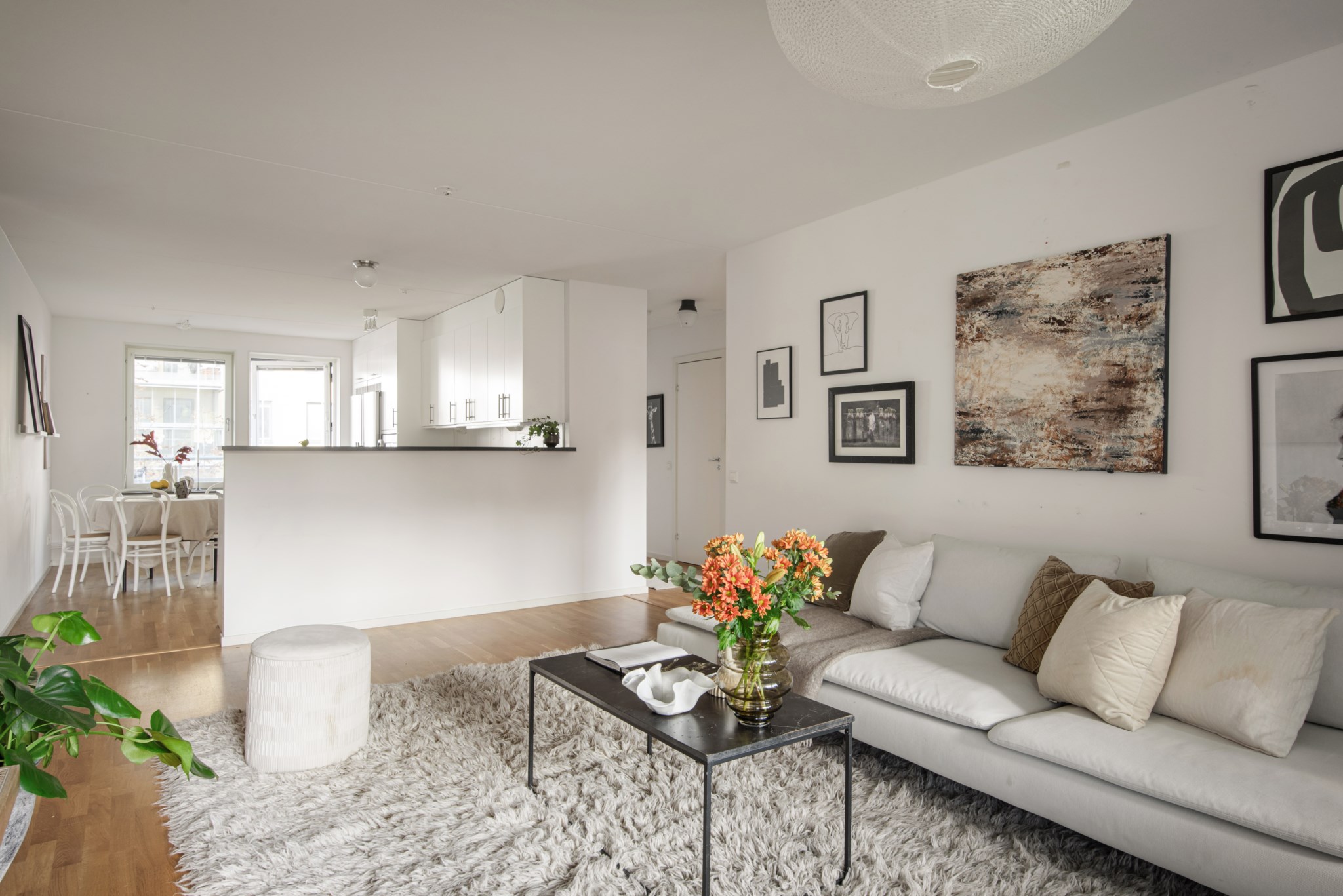 Öppet och socialt vardagsrum som bjuder på fint ljusinsläpp, generösa sällskapsytor och gott om plats för soffa och matgrupp. Härifrån nås en av lägenhetens två balkonger.