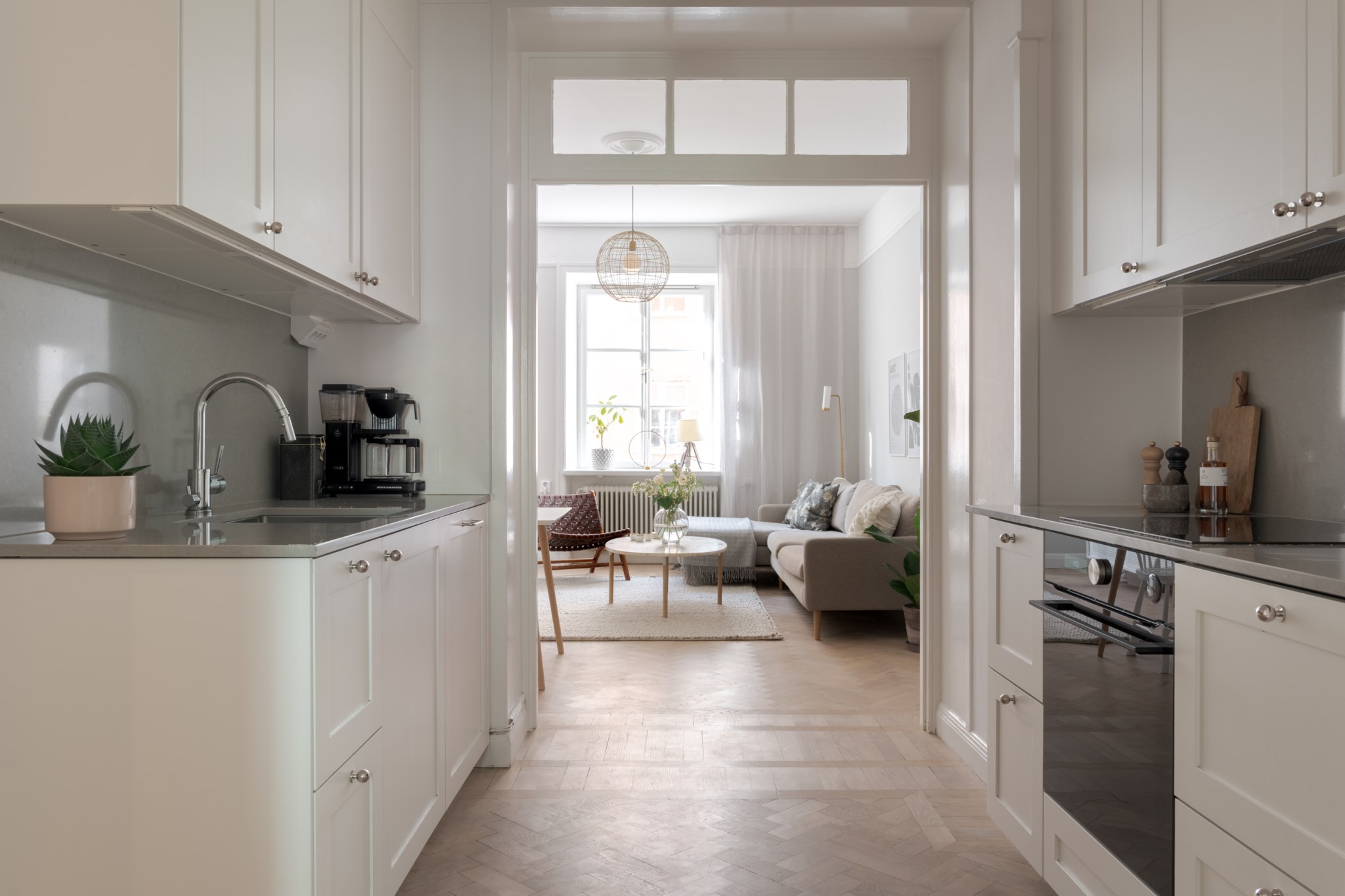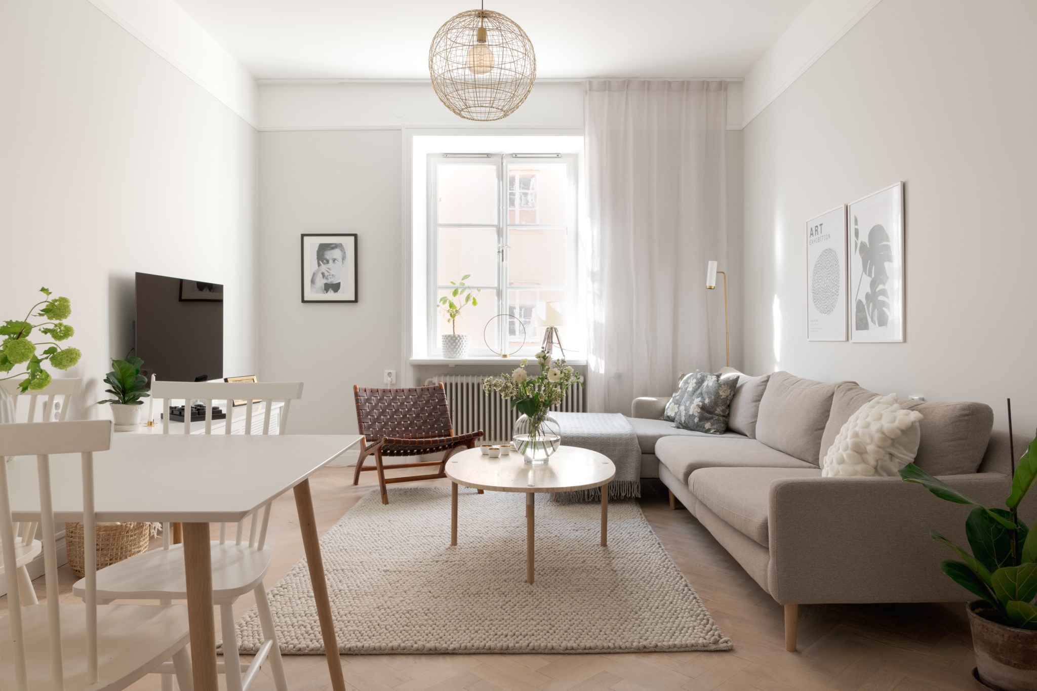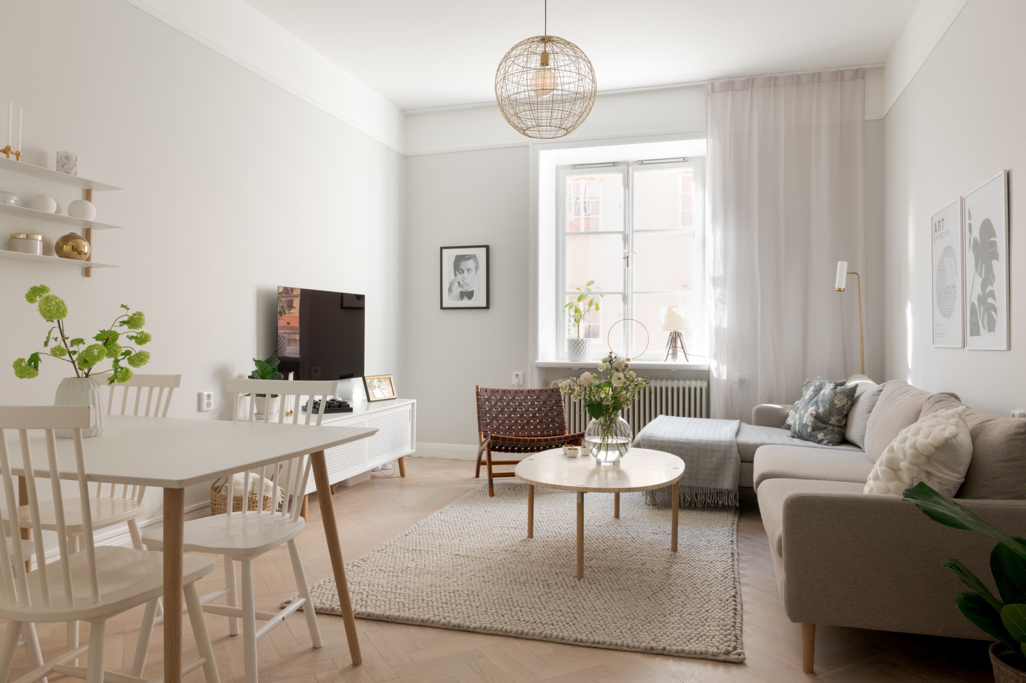 Ljust och lättmöblerat vardagsrum med sobert färgsatta väggar och vacker fiskbensparkett på golvet. Här ryms en matplats, en större soffgrupp samt mindre möblemang såsom fåtöljer och mediamöbel. Fint ljusflöde från stort fönster som vetter ut mot Garvar Lundins Gränd.