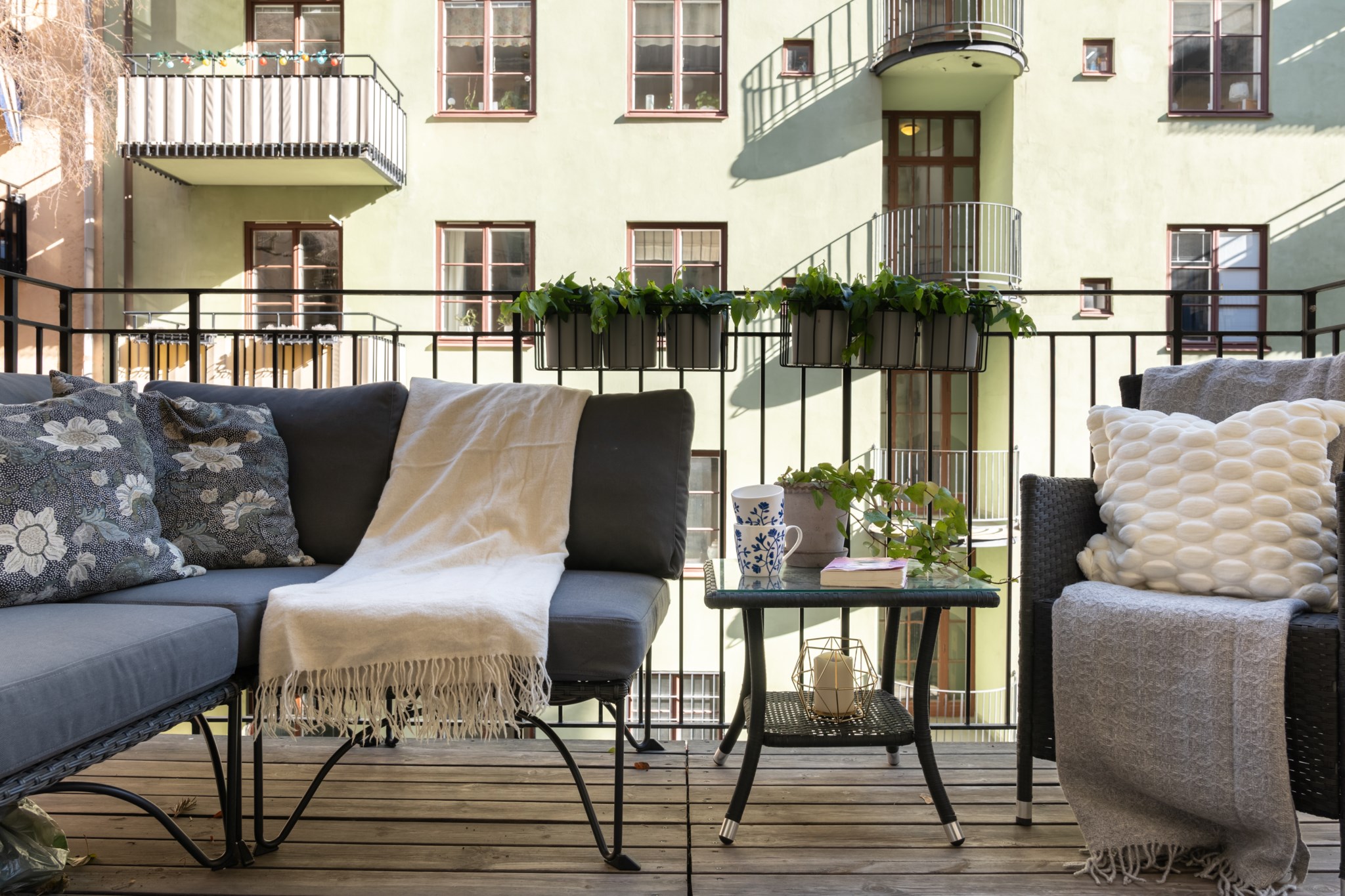 Stor och mysig balkong belägen i öst. Här kan man njuta av förmiddagssolen. Balkongen vetter ut mot föreningens samt grannföreningarnas lummiga och välskötta gårdar. Balkongen rymmer möblemang samt planteringar.