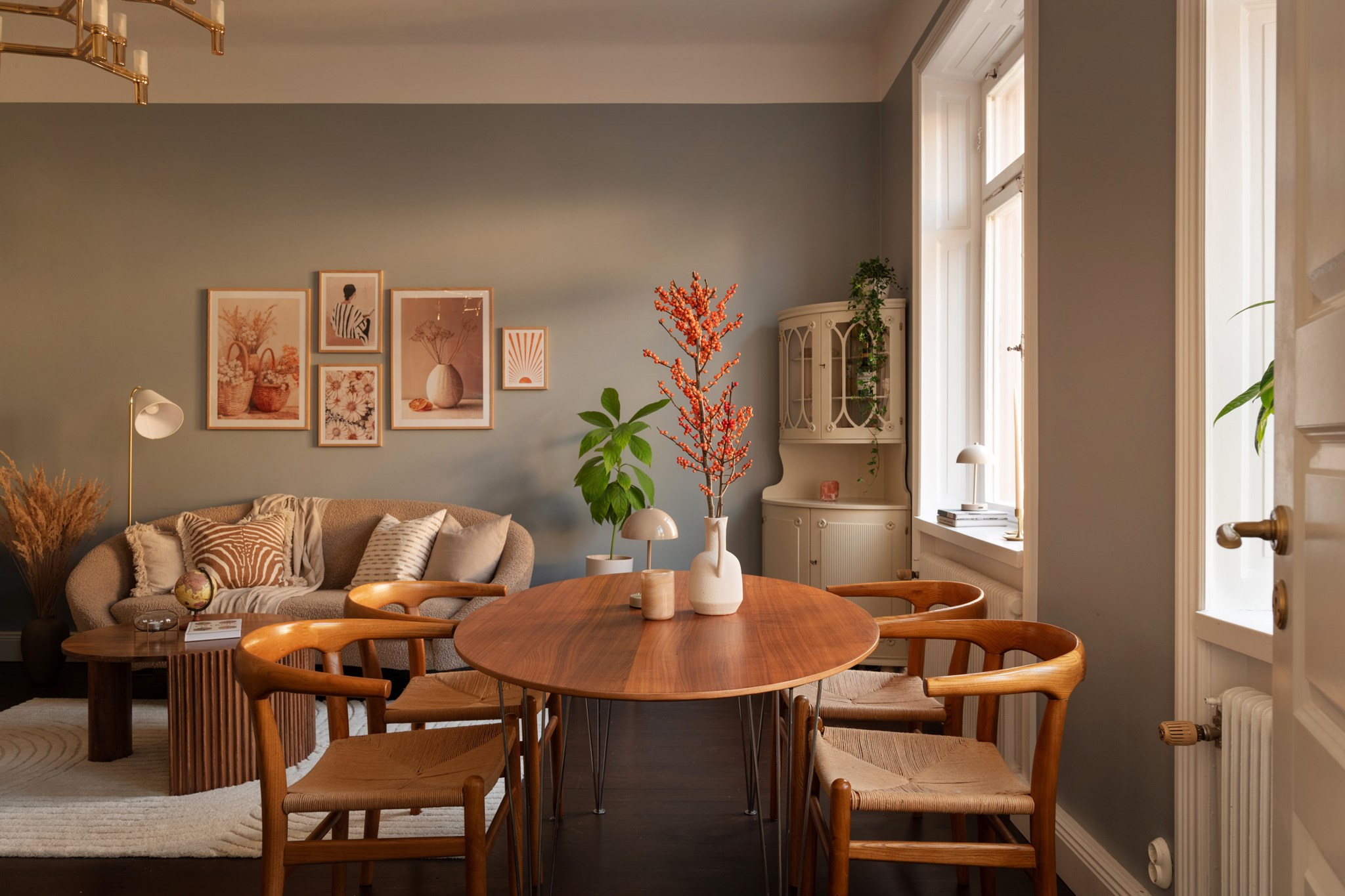 Redan i hallen möts man av den generösa takhöjden om 3,10 meter. Plats för avhängning och förvaring i inbyggd garderob samt vägghängd byrå med bänkskiva i betong.
