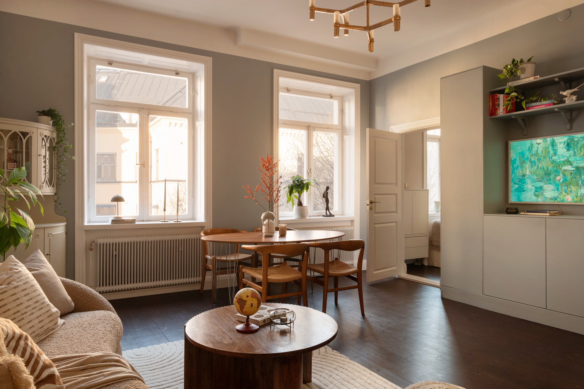 Magiskt sällskapsrum med två höga fönster i fil med djupa speglade nischer i original. Rummet är stort och volymiöst vilket skapar generösa sällskapsytor och inbjuder till socialt liv med mingel och middagar. Otroliga takhöjden om ca 3,10 meter och vackert rustikt trägolv ger fin balans med det fina ljusinsläppet. Bra yta med gott om plats för soffgrupp, middagsmöbel och övrig önskad möblering.
