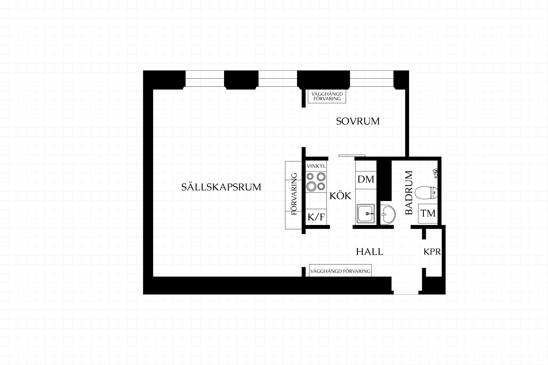 Smart och fullt utrustat kök med snickerier upp till tak från Kvik vilket ger bra förvaring. Maskinell utrustning från Siemens med induktionshäll, inbyggnadsugn, fläkt samt integrerad kyl/frys och diskmaskin. Rustik skjutdörr med spröjsat industriglas mot sovrummet ger fint ljusinsläpp.