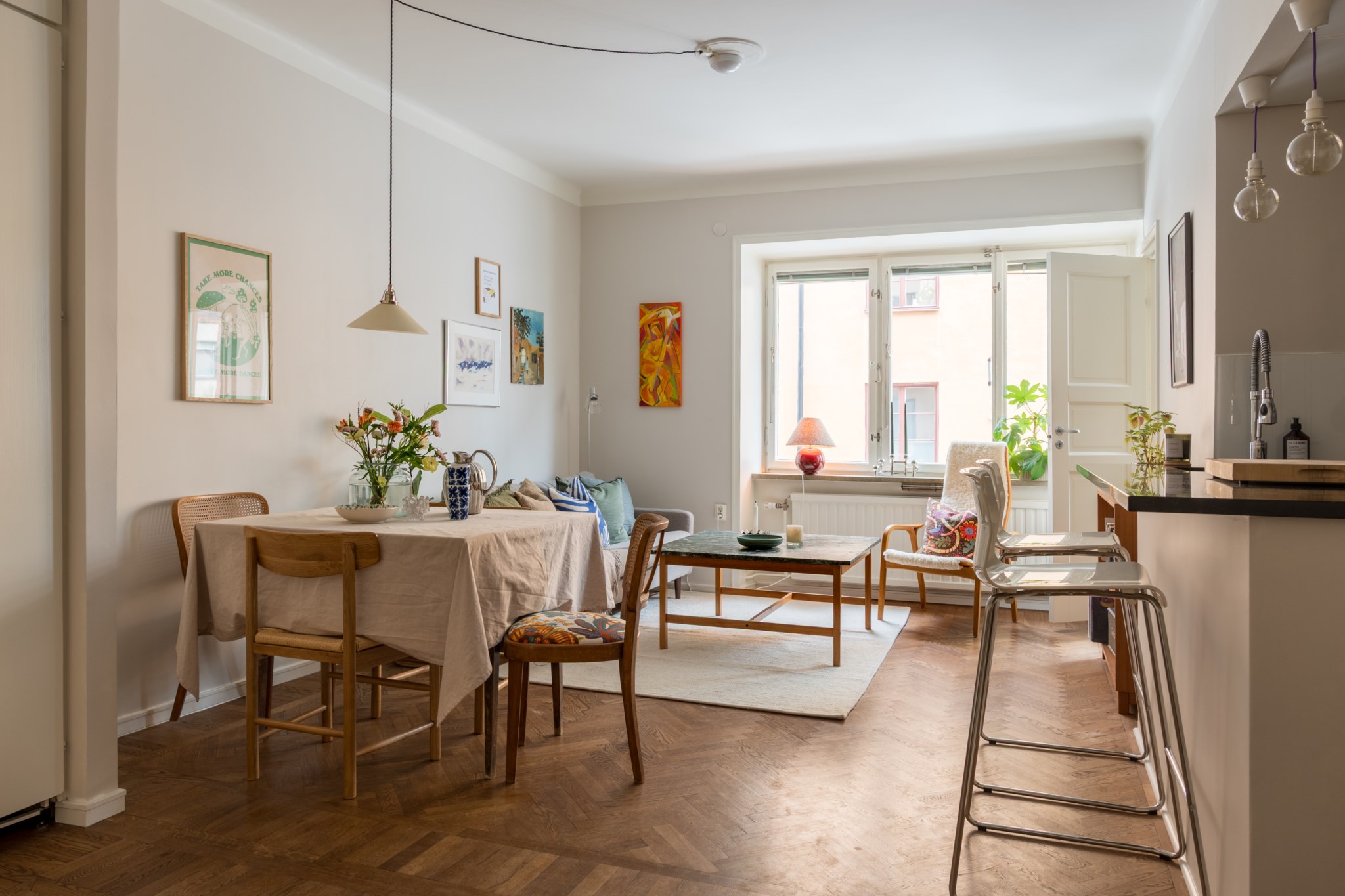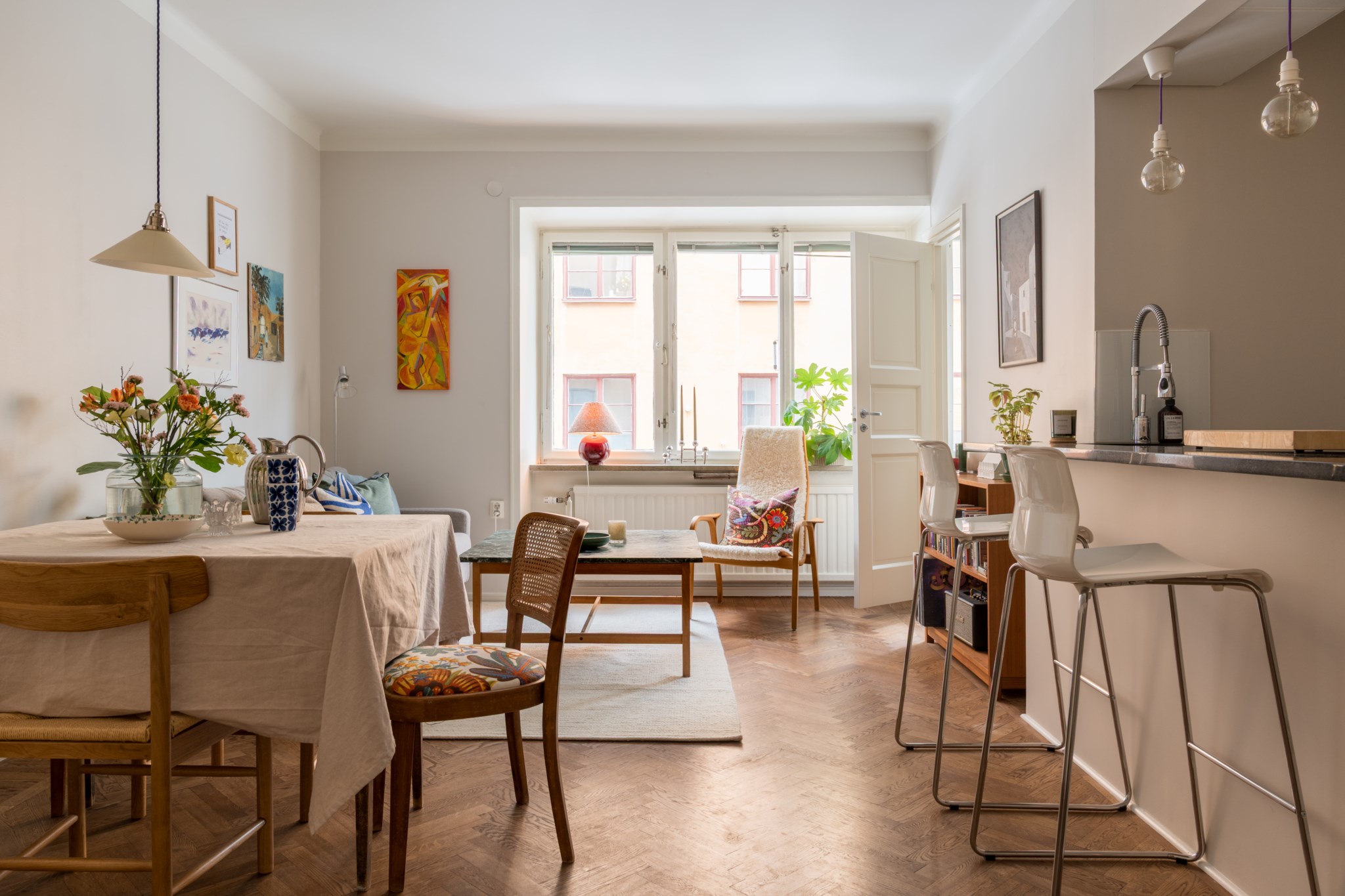 Optimalt planerad tvåa med social planlösning som bjuder in till umgänge! Här finns gott om plats för att samla vänner kring middagsbordet eller vid köksön. Bostaden håller ett mycket gott skick och har fina originaldetaljer kvar såsom vacker fiskbensparkett, skafferi och klädkammare i original och stora fönsterpartier som vittnar om husets byggår 1935. Lägenheten är lättmöblerad och passar paret såväl som singeln. Bostaden ligger i ett stilrent funkishus i populära SoFo och är placerat mellan Nytorgets pulserande kvarter med restaurangtäta gator och Skanstulls utmärkta kommunikationer.