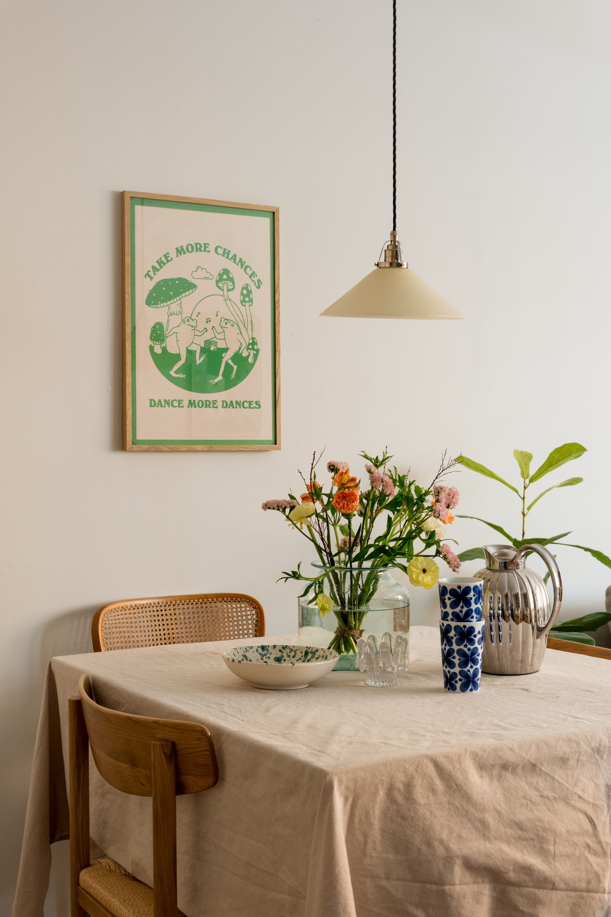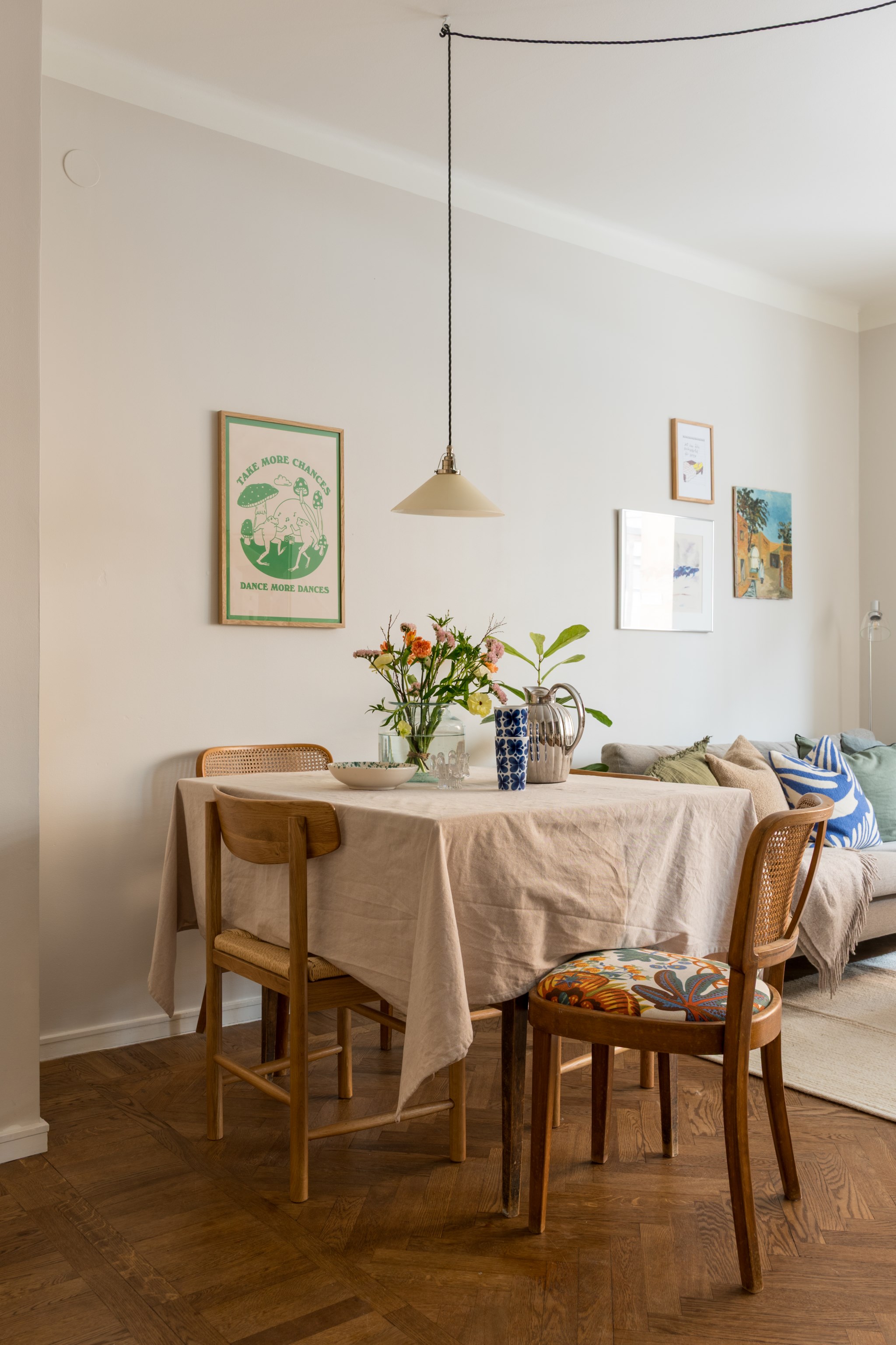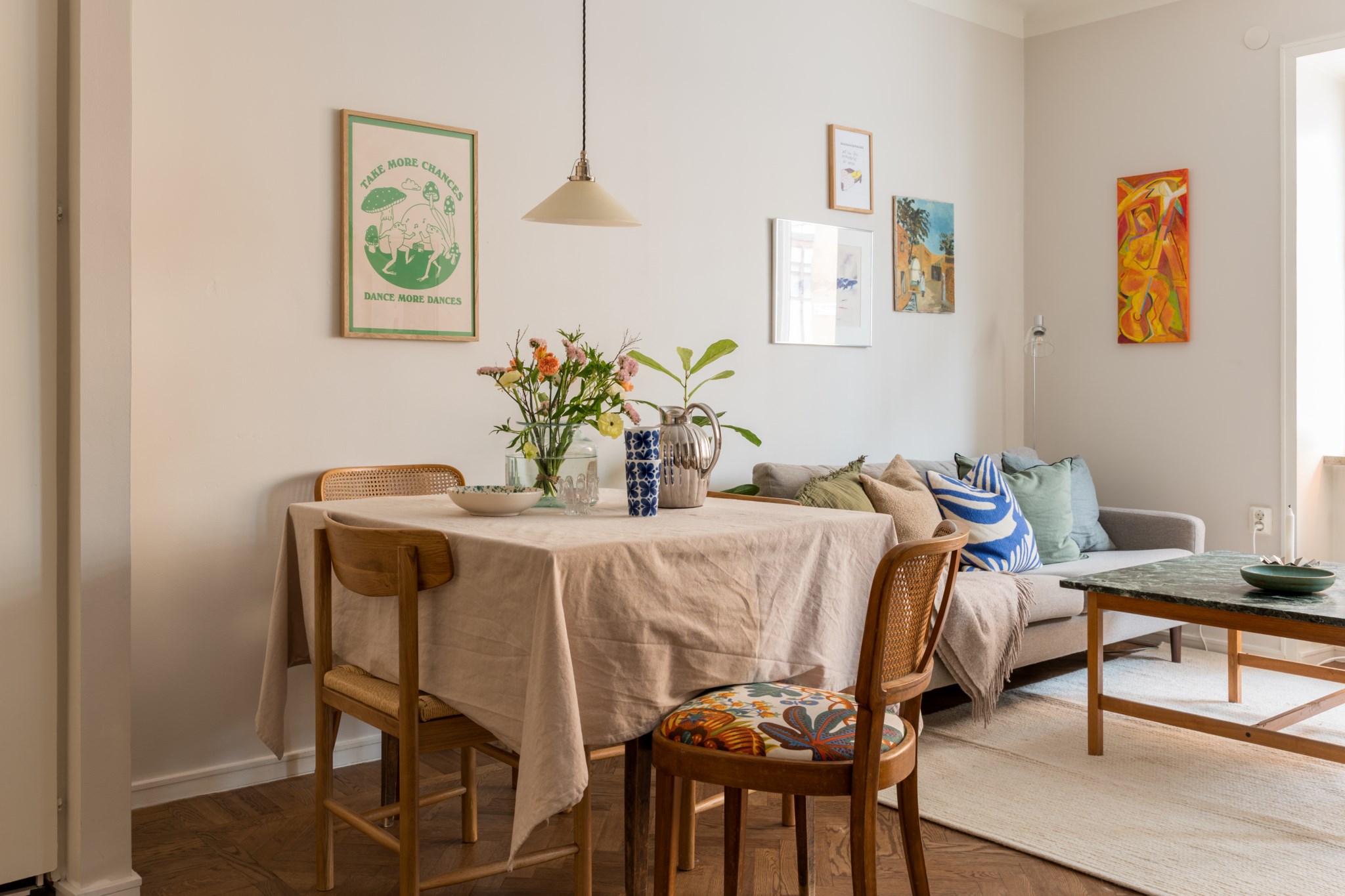 Ljust och lättmöblerat vardagsrum med öppen planlösning till kök. Vardagsrummet rymmer en större matplats för 6-8 personer, soffa, byråer, soffbord samt mindre möblemang. Fint ljusflöde från stort fönsterparti.