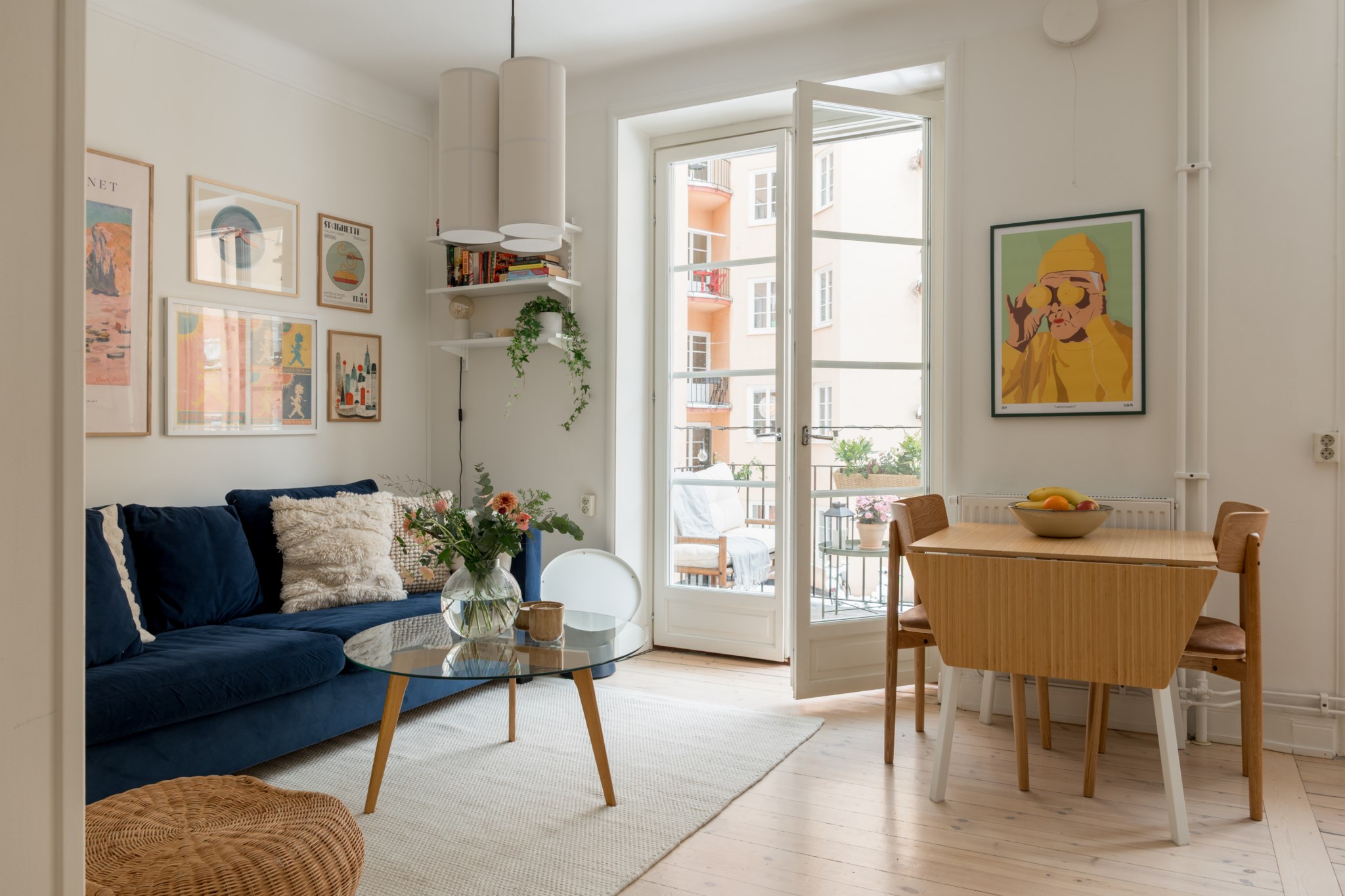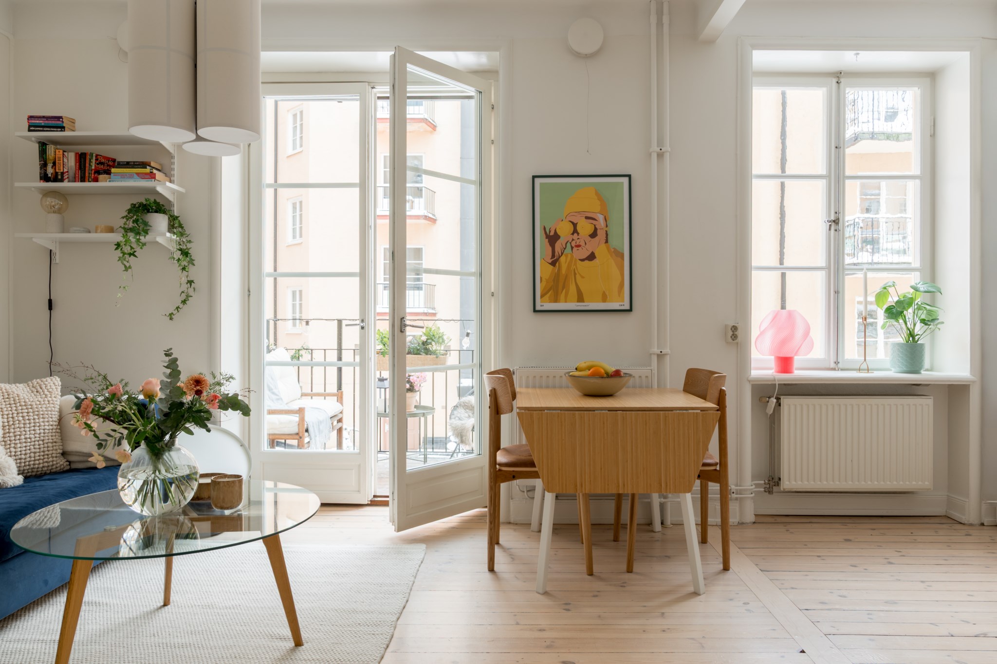 Föga förvånande ligger alltså vardagsrummet intill köket. Här ryms soffgrupp, stort matbord och förvaringsmöbel. Dubbeldörrarna mot balkongen ger ett fint ljusinsläpp.