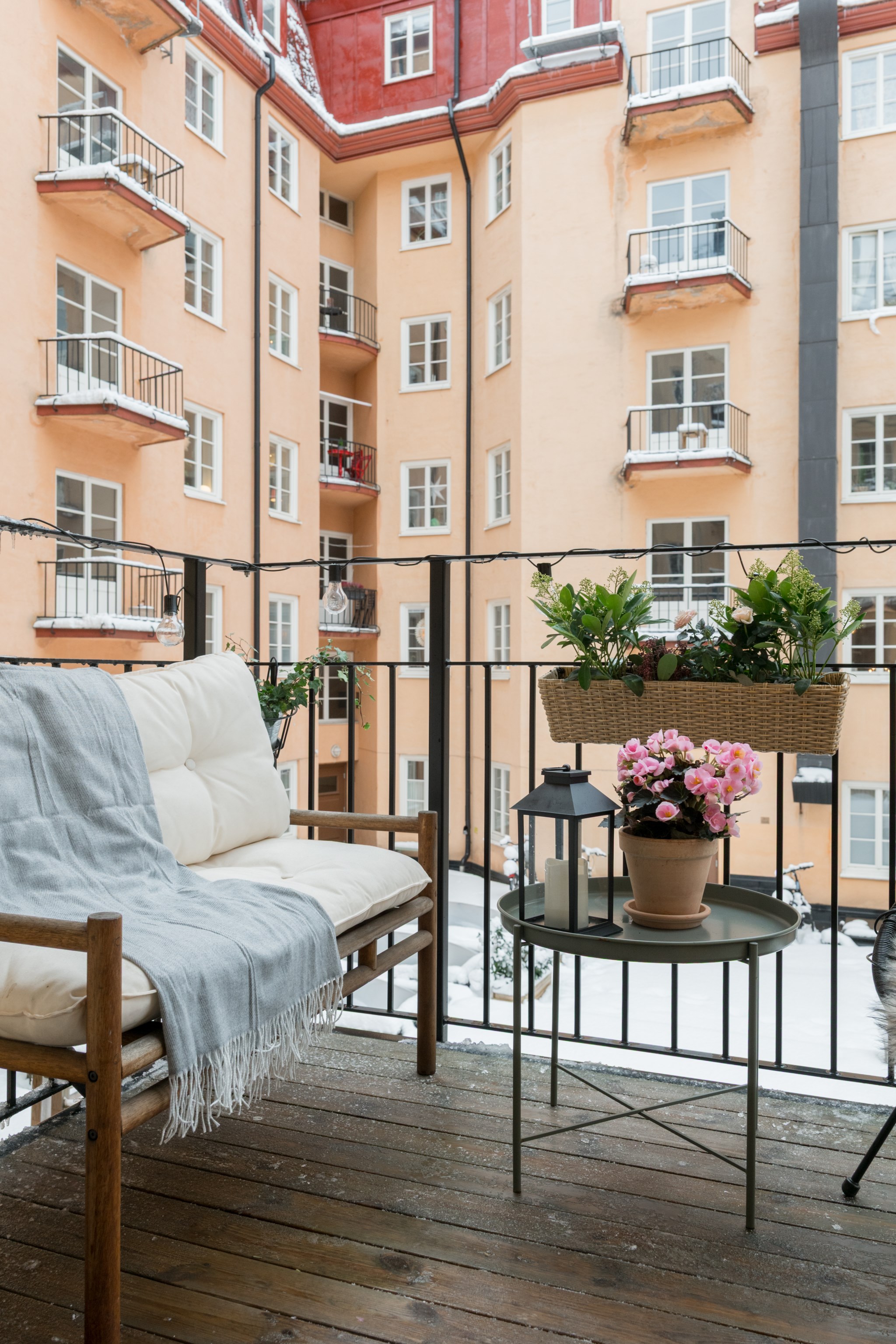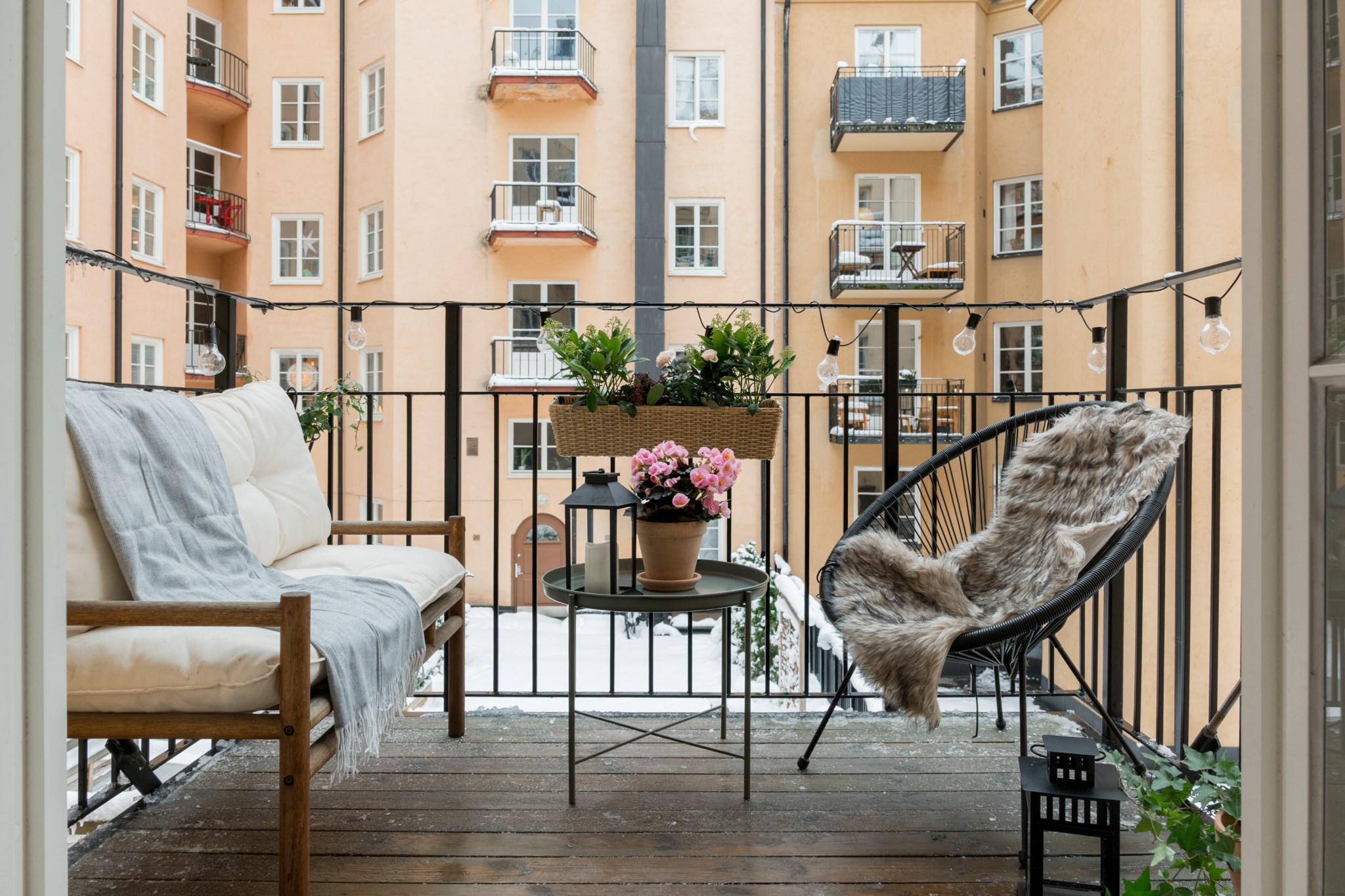Balkongen ligger i västläge mot innergården. Det är lugnt och tyst och under de ljusare månaderna ligger solen på under större delen av eftermiddagen.