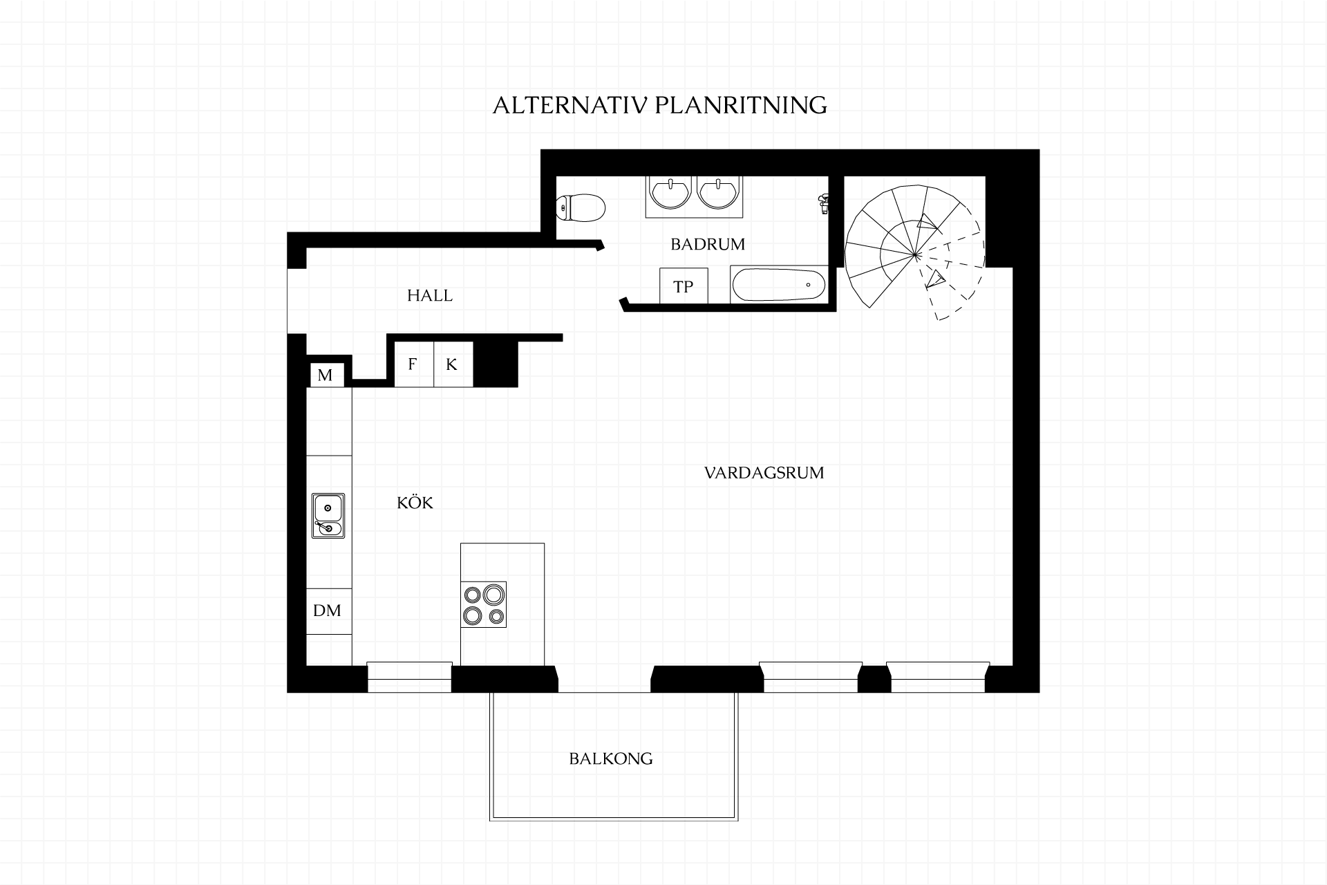 - Fräscht badrum med kaklade väggar och klinkergolv. Här finns dusch, WC, handfat och spegel. Möjlighet finns att göra ett större badrum, se alternativ planritning.