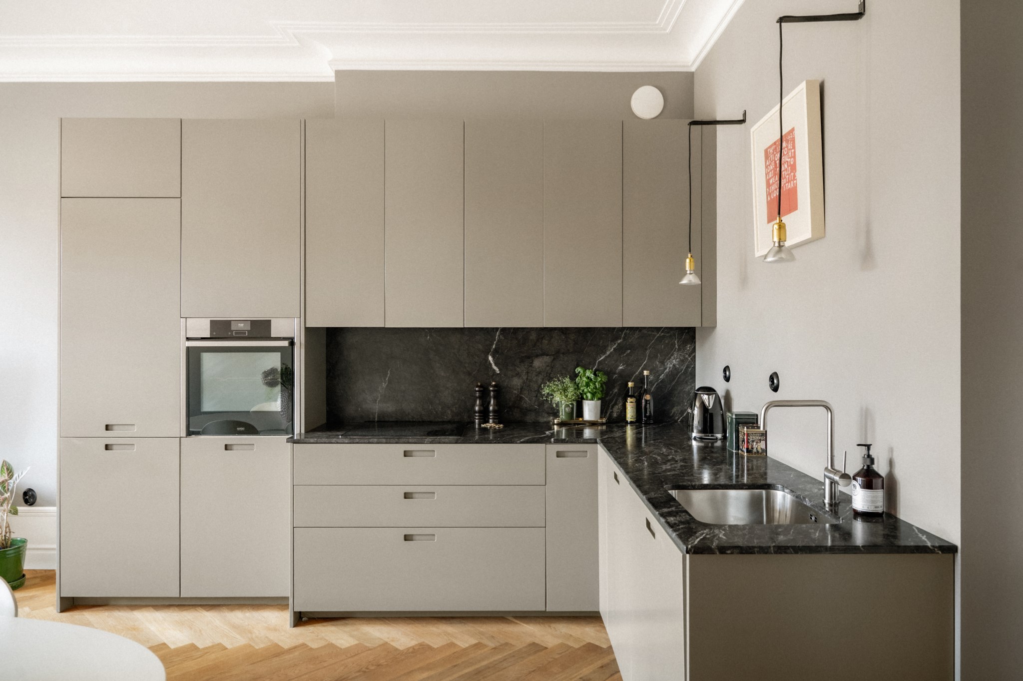 Vackra trägolv med höga socklar, högt till tak, varma färger på väggarna samt snygga strömbrytare från Renova.