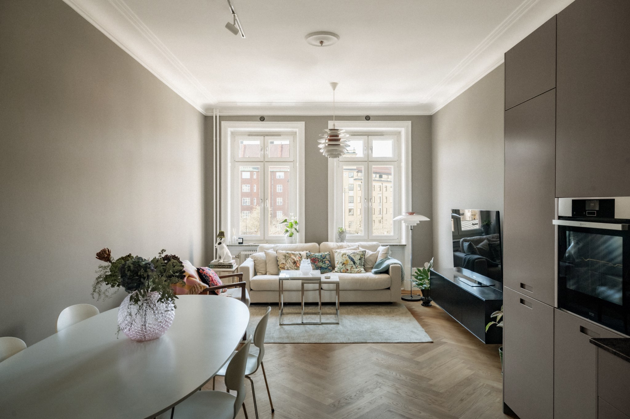 Utmärkt kök med gott om skåp och bra arbetsytor. Kyl/frys, diskmaskin, induktionshäll, fläkt och ugn. Öppen planlösning mot vardagsrummet. Vardagsrummet är lättmöblerat med naturlig plats för soffgrupp och stort matbotbord. Två stora fönster med ogenerad utsikt över Hälsingehöjden och takåsar.
