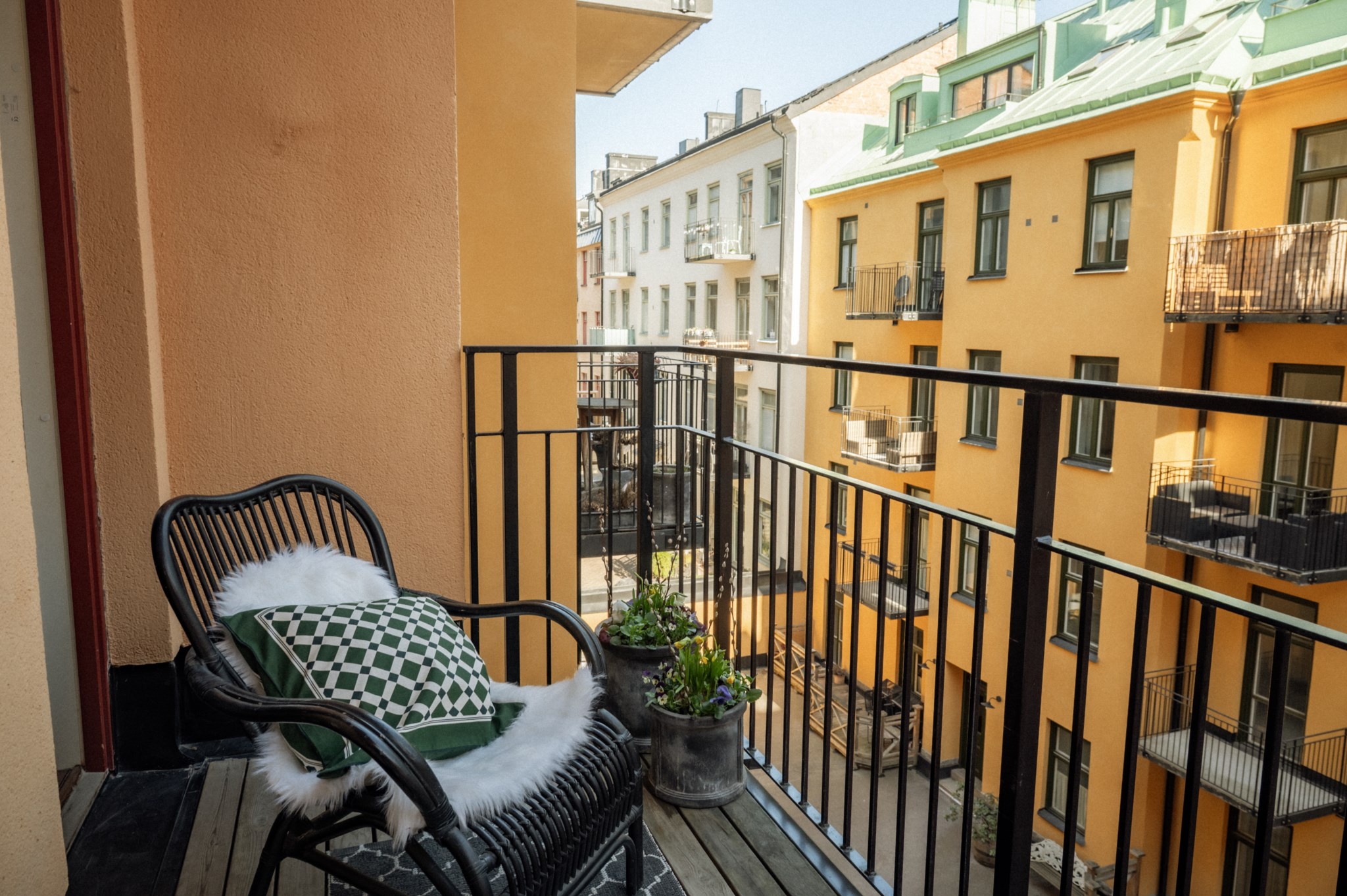 Stor balkong mot föreningens innergård med sol fram till lunch under sommarmånaderna. Plats för bord, stolar och planteringar.