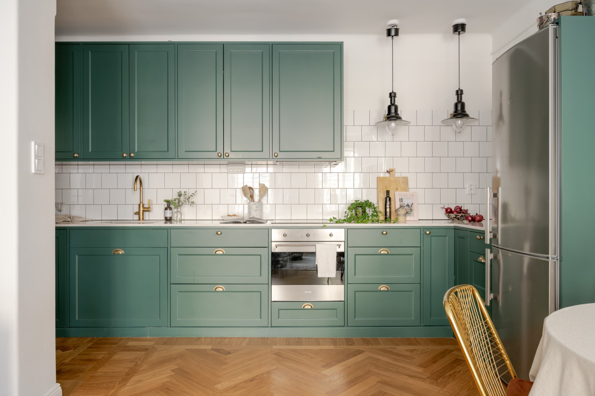 Modernt och stilrent kök med bra arbetsytor och generösa förvaringsutrymmen. Köket är utrustat med kyl/frys, spis, ugn och diskmaskin. Öppen planlösning mot vardagsrummet.
