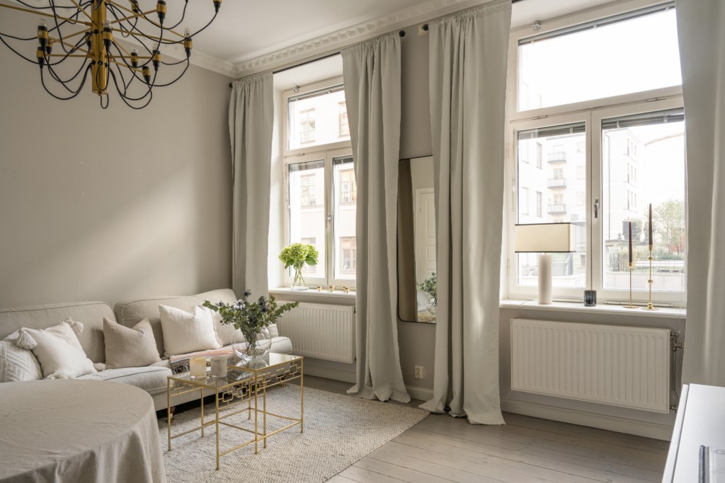 Bostaden som har ett vackert eftermiddags och -kvällsljus präglas av en tidstypisk charm med detaljer såsom fiskbensmönstrad parkett, brädgolv med synliga furutiljor, väl tilltagen takhöjd, speglade dörrar, överfönster och vackra fönster med spröjs som samspelar med moderna materialval i harmonisk balans. Från samtliga fönster bjuds på en otroligt vacker och fri utsikt som sträcker sig från Stadshuset till Långholmen och bort mot Kungsholmen och utsikten blir än mer framträdande när man tar sig ut på balkongen genom de vackra, glasade dörrarna med spröjs.